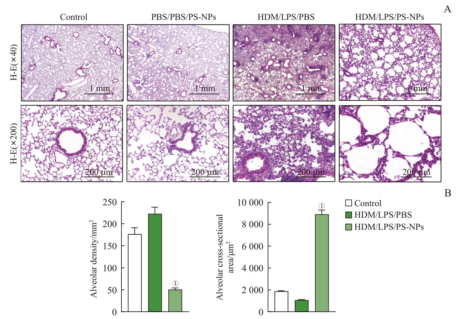 | 图3 暴露于PS-NPs对重症哮喘小鼠肺泡结构的影响 Note: A. Mouse lung alveolar pathological sections stained with H-E (×40, ×200). B. Analysis of alveolar density and alveolar cross-sectional area. ①P<0.001, compared with the HDM/LPS/PBS group. |
