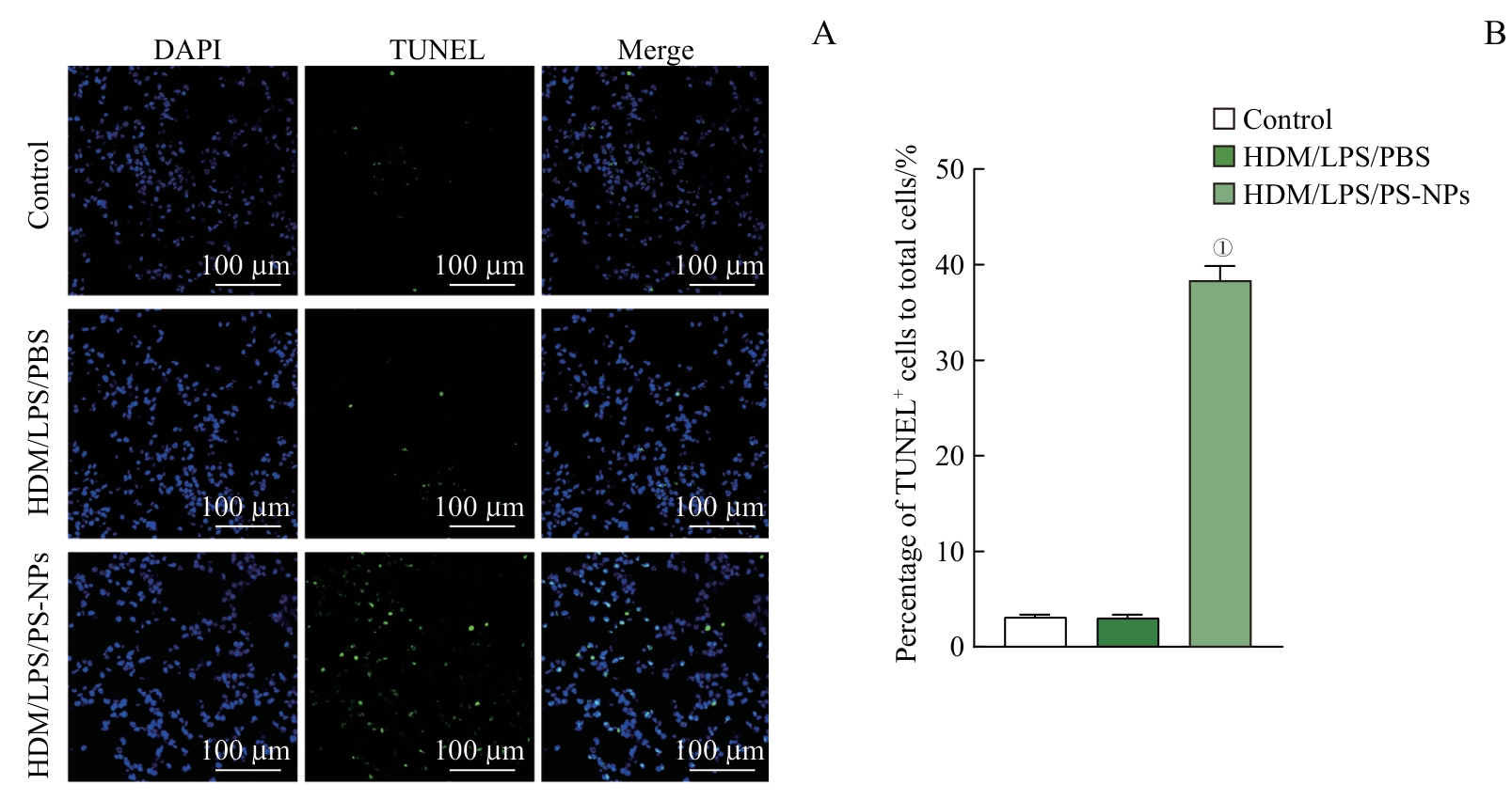 | 图5 PS-NPs暴露后重症哮喘小鼠肺组织的细胞凋亡水平 Note: A. TUNEL staining of mouse alveolar pathological sections (×400). AT2 cells were stained with TUNEL (green) and DAPI (blue). B. The results of apoptosis rates in each group. ①P<0.001, compared with the HDM/LPS/PBS group. |