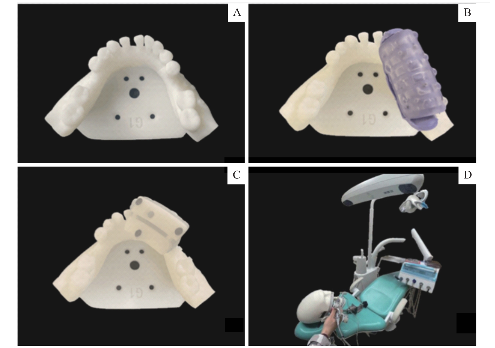 | 图3 3D打印模型及动态导航系统 Note: A. 3D-printed mandibular model with a single posterior tooth defect. B. A model equipped with U-shaped tube registration device. C. A model equipped with two-in-one registration device. D. An active infrared implant navigation system which can track and locate mobile phones and reference plates. |