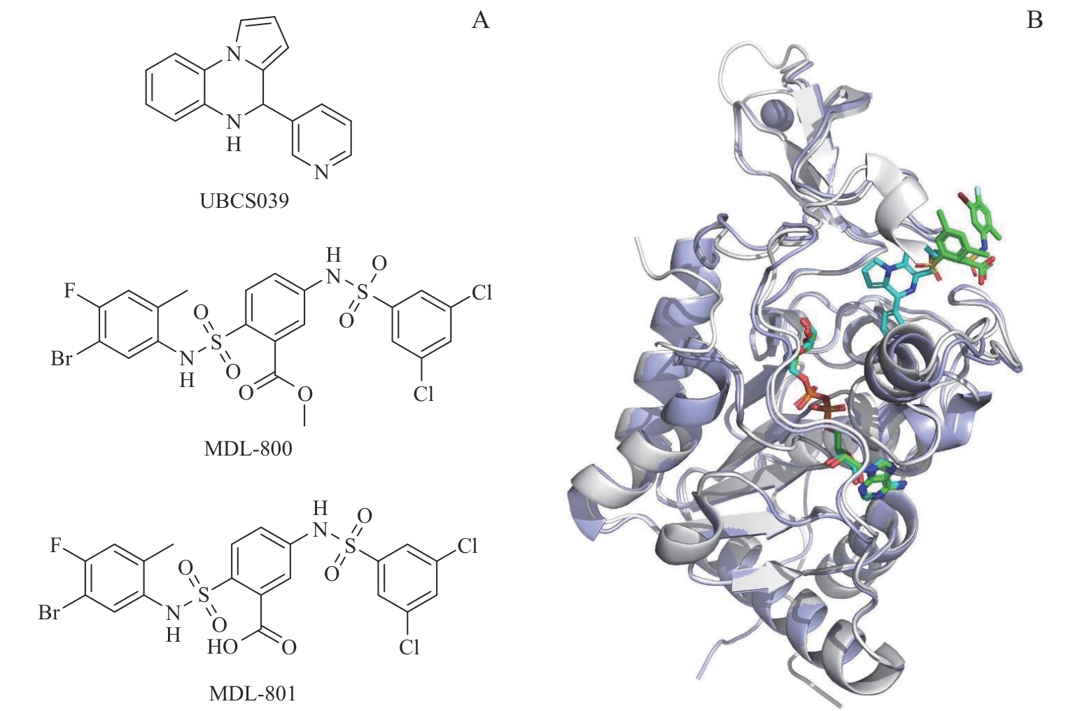 | 图3 SIRT6 激动剂的化学结构和结合模式 Note: A. Chemical structures of SIRT6 agonist, MDL-800, MDL-801, and UBCS039. B. The binding modes of MDL-801 or UBCS039 with SIRT6. MDL-801 and UBCS039 are shown in green and blue sticks, respectively. |