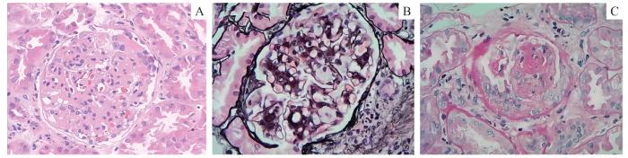 Note: A/B. Hematoxylin-eosin (H-E) staining (A) and periodic acid-silver methenamine (PASM) staining (B) show mesangial cells and stroma with moderate to severe hyperplasia, thickening of the basement membrane, segmental mesangial insertion, and “double track sign” formation. C. Periodic acid schiff (PAS) staining show microcytic crescent formation.