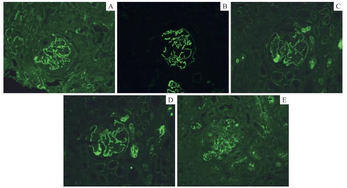 Note: A. IgG is deposited in a linear manner along the glomerular capillaries, and some distal tubular basement membranes are positive. B. Positive staining for IgG1. C/D. Positive light chain kappa (C) and lambda (D). E. C3 deposition along the mesangial region of the glomerulus in granular form.