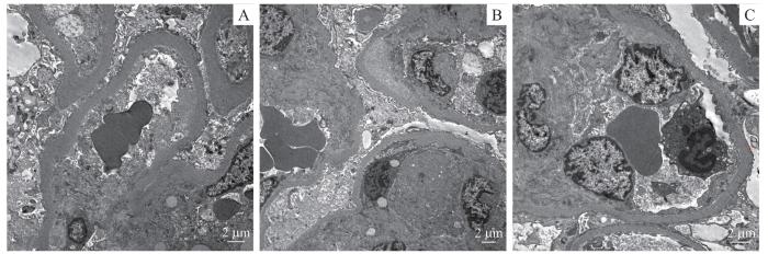 Note: A. The glomerular basement membrane was segmentally thickened, and the foot process was diffusely fused. B. The mesangial cells and matrix proliferation were obvious, and a small amount of low-density electron dense matter was deposited in the mesangial area. C. Capillary endothelial cells vacuole degeneration, red blood cells visible in the lumen.