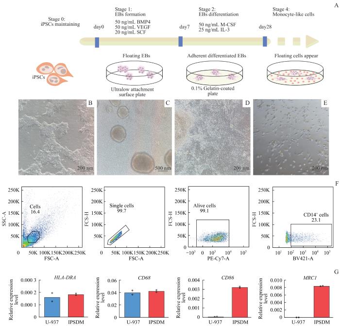 Note: A. Flowchart of iPSCs differentiation into IPSDMs. B. Morphology of iPSCs used for differentiation (×100). C. Morphology of iPSCs on the 3rd day of differentiation into EBs (×40). D. Morphology of EBs on the 7th day of differentiation into monocytes (×100). E. Morphology of cells in the medium on the 21st day of EB differentiation into monocytes (×100). F. Flow cytometry analysis results of CD14 marker expression in IPSDMs. G. RT-qPCR results of HLA-DRA, CD68, CD86 and MRC1 gene expression levels in IPSDMs and U-937 cells.