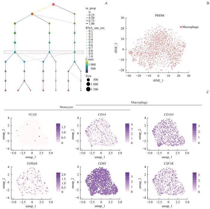 下载数据后,首先对PBDM的单细胞测序数据进行质控、降维。为了确定最合适的聚类分辨率,生成聚类树(图2A),结果可见聚类树从分辨率0.6开始出现较多半透明的分支,代表着不稳定的分群,可能造成过度聚类,因此选择聚类分辨率0.6进行后续分析,此时细胞可以形成3个聚类。参考SingleR软件包注释结果及相关研究[19]对细胞类型进行注释,发现PBDM中的3个聚类的细胞类型均为巨噬细胞,如图2B所示。检查PBDM中与单核-巨噬细胞相关的表面标志物的基因表达状况,基因表达分布特征图如图2C所示,单核细胞高表达的标志物多能蛋白聚糖(versican,VCAN)基因与S100钙结合蛋白A8(S100 calcium binding protein A,S100A8)基因在PBDM中的表达分布已经十分零星;作为单核-巨噬细胞共享的标志基因CD14与CD68在PBDM中的表达模式具有典型巨噬细胞的特征,即CD14的表达较低而CD68的表达水平较高;另外,巨噬细胞特异性的CD163基因及集落刺激因子1受体(colony stimulating factor 1 receptor,CSF1R)基因在大多数PBDM中均有较高的表达。这些标志基因的表达模式证实了GSE126085数据集中的细胞为巨噬细胞。