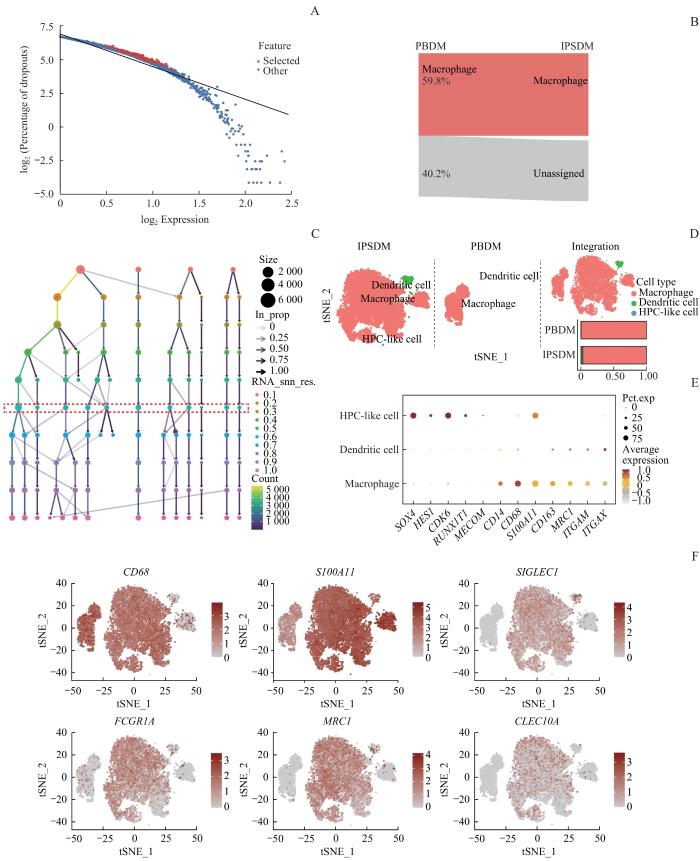 我们参考ACT工具及相关研究[18-20],对IPSDM的单细胞测序数据进行人工分析与注释。首先通过生成聚类树确定合适的聚类分辨率为0.6(图3C)。根据每个聚类的细胞特异性标志基因的表达对聚类进行注释。注释后的细胞类型、对应的标志基因和细胞占比如表2所示。IPSDM最主要的组分为巨噬细胞(图3D),占97.15%。这群细胞高表达巨噬细胞重要的标志基因CD68,巨噬细胞其他相关标志基因CD14、CD163与S100钙结合蛋白A11(S100 calcium binding protein A11,S100A11)在巨噬细胞中亦有广泛表达(图3E)。其次是造血前体细胞样细胞(hematopoietic progenitor cell-like cell,HPC-like cell),占2.71%。这类细胞具有多能性,具有分化为单核-巨噬细胞的潜力,其标志基因包括SRY-Box转录因子4(SRY-box transcription factor 4,SOX4)、Hes家族BHLH转录因子1(Hes family BHLH transcription factor 1,HES1)、细胞周期蛋白依赖性激酶6(cyclin dependent kinase 6,CDK6)、RUNX1伴侣转录辅阻遏物1(RUNX1 partner transcriptional co-repressor 1,RUNX1T1)、MDS1和EVI1复合位点(MDS1 and EVI1 complex locus,MECOM)。第三类细胞被注释为树突状细胞,此类细胞的标志基因为整合素亚基αM(integrin subunit alpha M,ITGAM)和整合素亚基αX(integrin subunit alpha X,ITGAX);该类细胞具有ITGAM和ITGAX高表达但CD68低表达的特点,这群细胞仅占约0.14%。值得一提的是,在整合IPSDM与PBDM数据后同时注释2组细胞数据集,PBDM除了巨噬细胞外,还出现了极少量的造血前体细胞样细胞,仅占约0.11%。