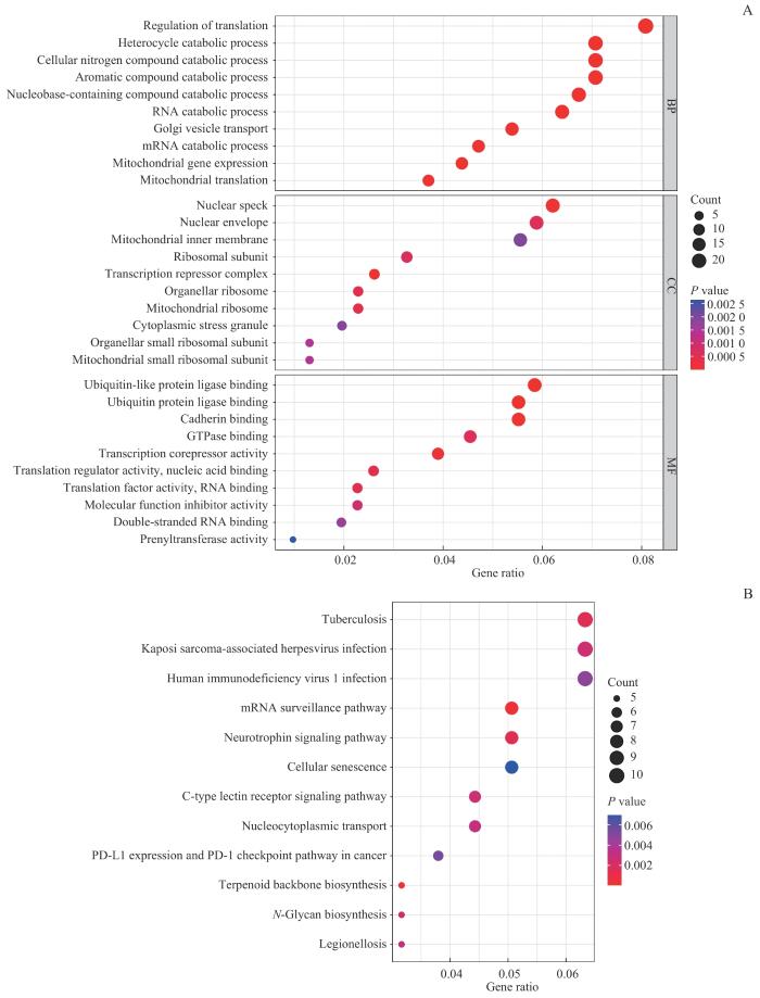为了进一步探究IPSDM与PBDM之间的差异,我们针对∣log2FC∣>0.25且校正P<0.01的DEG进行GO分析及KEGG通路富集分析。GO分析结果(图4A)显示:分子功能主要富集于泛素样蛋白连接酶结合,可能与蛋白质泛素化降解相关;细胞组分主要定位于核斑点与核膜,可能涉及RNA的加工、转录修饰;生物学过程则主要富集于翻译调控。GO结果提示,DEG可能会影响包括蛋白质合成、降解在内的多种核心生物过程。为了进一步了解DEG背后潜在的生物学作用,我们又进行了KEGG通路富集分析,结果(图4B)显示排名前三的3个通路分别为结核病、卡波西肉瘤相关疱疹病毒感染、人类免疫缺陷病毒1型感染。这3类病原体均为胞内感染病原体,而巨噬细胞在胞内感染免疫中扮演重要角色。此外,KEGG通路富集分析还发现DEG富集于C型凝集素受体信号通路,该通路也与巨噬细胞的病原体识别及免疫反应触发有关。因此IPSDM与PBDM之间的DEG可能对巨噬细胞的免疫功能有潜在影响。