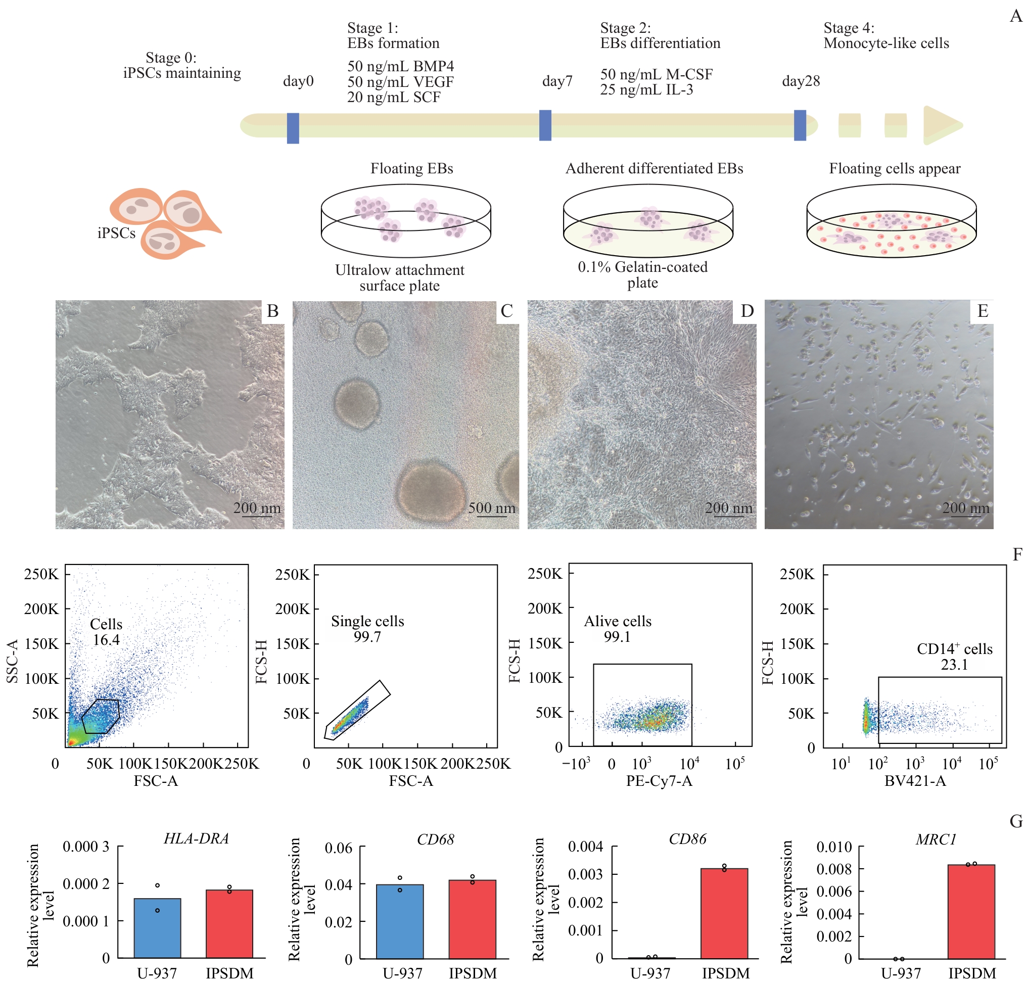 | 图1 iPSC分化为IPSDM的过程及鉴定 Note: A. Flowchart of iPSCs differentiation into IPSDMs. B. Morphology of iPSCs used for differentiation (×100). C. Morphology of iPSCs on the 3rd day of differentiation into EBs (×40). D. Morphology of EBs on the 7th day of differentiation into monocytes (×100). E. Morphology of cells in the medium on the 21st day of EB differentiation into monocytes (×100). F. Flow cytometry analysis results of CD14 marker expression in IPSDMs. G. RT-qPCR results of HLA-DRA, CD68, CD86 and MRC1 gene expression levels in IPSDMs and U-937 cells. |