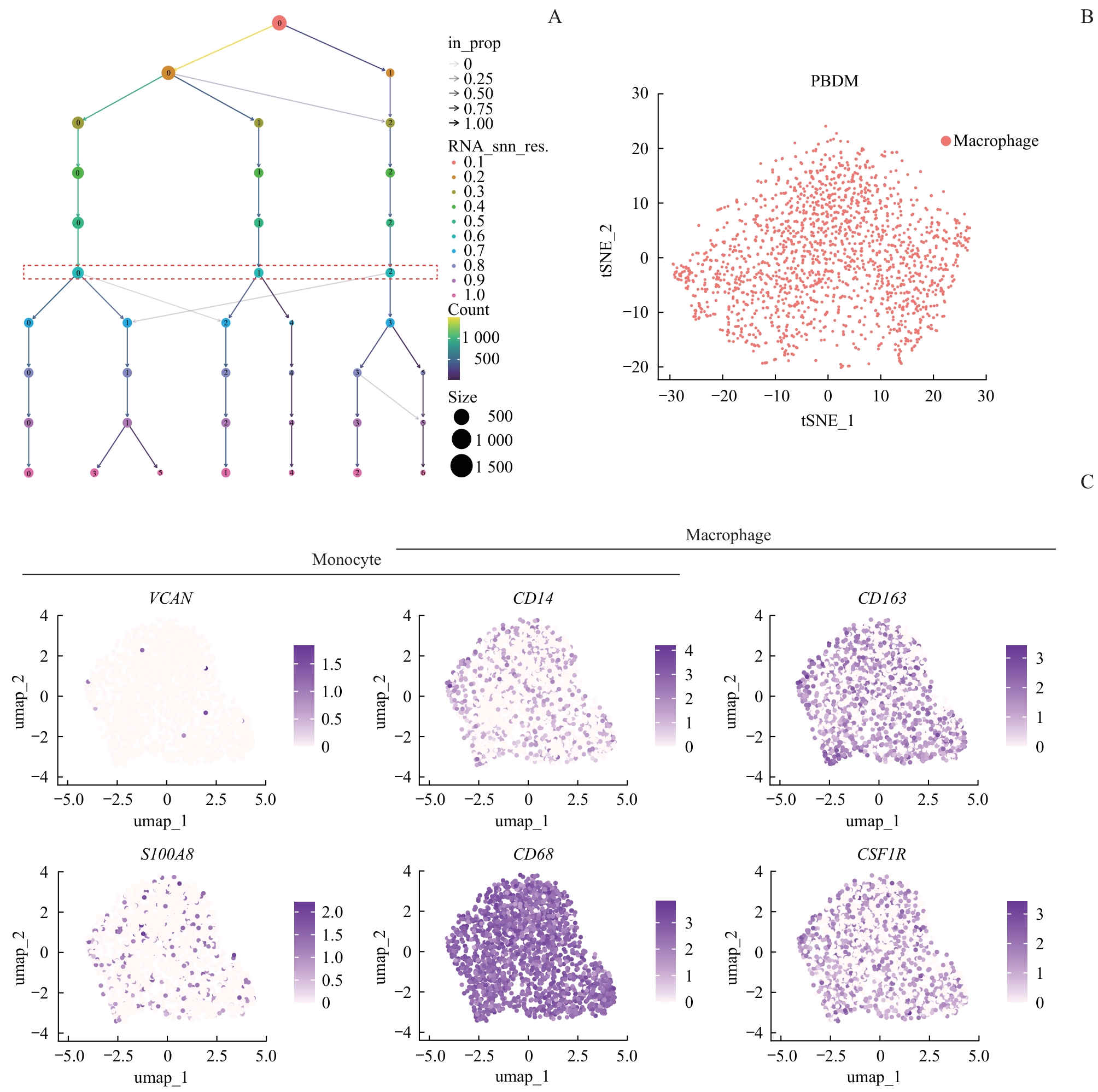 | 图2 GSE126085中PBDM样本细胞聚类过程及注释后的细胞分布特征图 Note: A. The cluster tree of the PBDM sample. B. Distribution of the PBDM sample after annotation. C. Feature distribution plots of marker gene expression in the PBDM sample. |