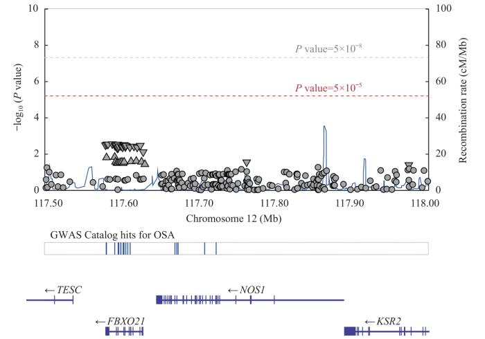 LocusZoom分析 NOS1 SNP与OSA发病风险的关联