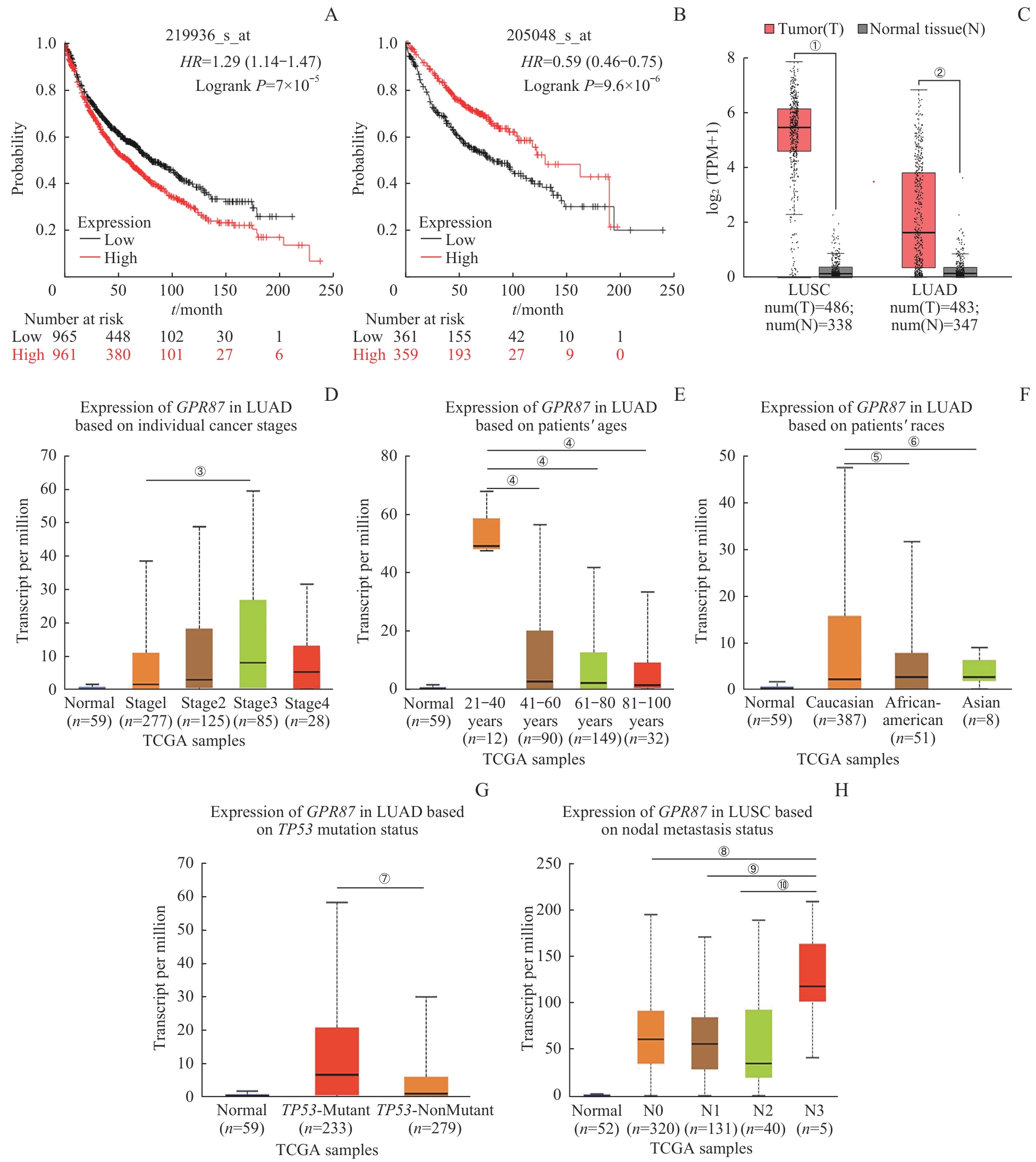 | 图1 GPR87 与 NSCLC的生物信息学分析 Note: GPR87 (A) and PSPH (B) were found to correlate with poor survival in NSCLC population with KM plotter. GPR87 mRNA levels in LUAD and LUSC (C) were both overexpressed, according to the GEPIA database. High expression of GPR87 was associated with poor clinical stage (D), age (E), race (F) and TP53 mutation status (G) in patients with LUAD, and with lymph node metastasis in patients with LUSC (H) in UALCAN database. Error bars represent the x±s. ①P=0.032, ②P=0.026, compared with the adjacent normal tissues. ③P=0.006, compared with stage1 LUAD patients. ④P<0.001, compared with the 21?40 year-old patients. ⑤P=0.005, ⑥P<0.001, compared with Caucasian patients. ⑦P<0.001, compared with the TP53-mutant group. ⑧P=0.007, ⑨P=0.005, ⑩P=0.004, compared with the N3-lymph node metastasis patients. |