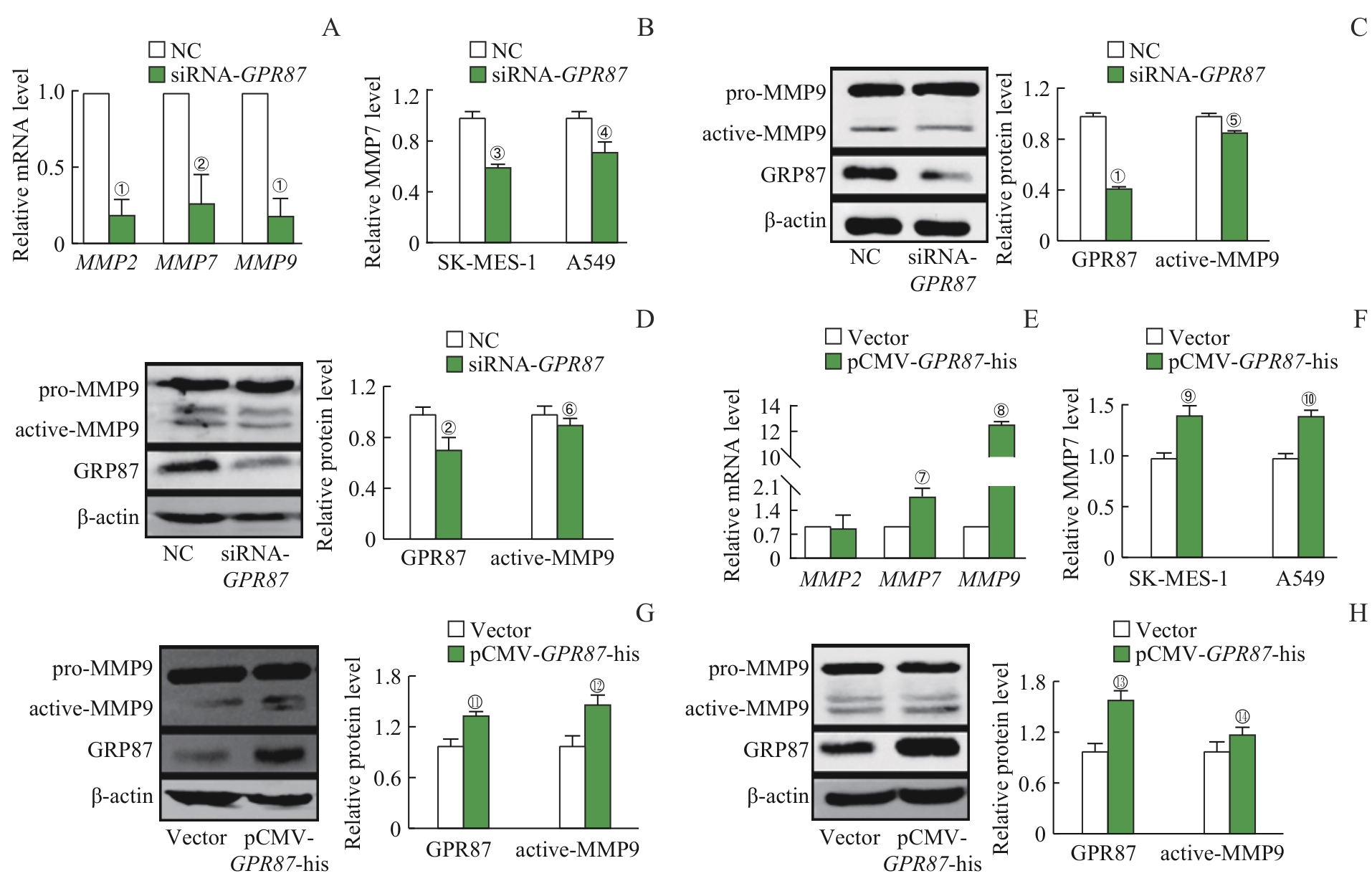 | 图5 GPR87 对NSCLC细胞MMPs表达的影响 Note: A. The mRNA expression of MMP2, MMP7 and MMP9 in SK-MES-1 cells treated with siRNA-GPR87 was decreased, as detected by RT-qPCR. B. The protein expression of MMP7 in the supernatant of SK-MES-1 and A549 cells treated with siRNA-GPR87 was decreased, as detected by ELISA. The protein expression of active-MMP9 and GPR87 was decreased in SK-MES-1 (C) and A549 cells (D) treated with siRNA-GPR87, as detected by Western blotting. E. The mRNA expression of MMP2, MMP7 and MMP9 was increased in A549 cells treated with pCMV-GPR87-his, as detected by RT-qPCR. F. The protein expression of MMP7 in the supernatant of SK-MES-1 and A549 cells treated with pCMV-GPR87-his was increased, as detected by ELISA. The protein expression of active-MMP9 and GPR87 was increased in A549 (G) and SK-MES-1 cells (H) treated with pCMV-GPR87-his, as detected by Western blotting. Error bars represent the x±s. ①P<0.001, ②P=0.008, ③P=0.013,④P=0.041, ⑤P=0.009, ⑥P=0.043, compared with the NC group. ⑦P=0.007, ⑧P<0.001, ⑨P=0.003, ⑩P=0.002, 11P=0.005, 12P=0.008, 13P=0.001, 14P=0.021, compared with the Vector group. |