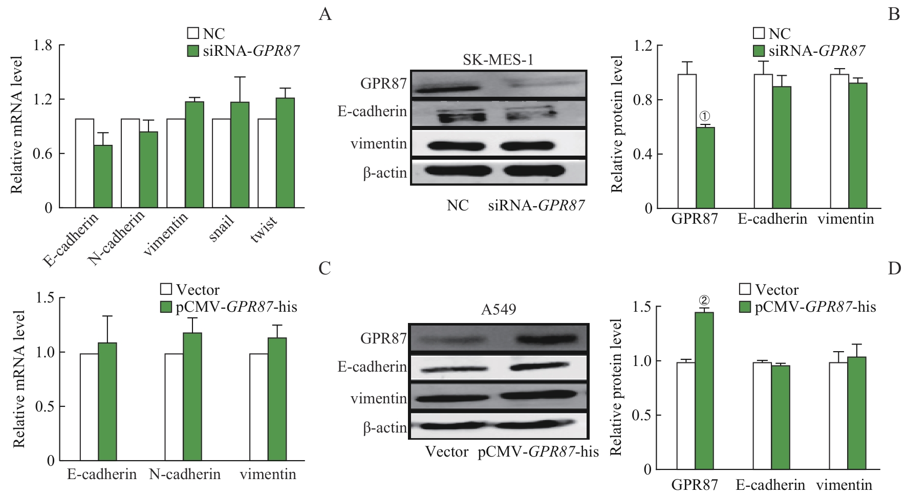| 图6 GRP87 对NSCLC细胞EMT的影响 Note: The mRNA expression (A) of E-cadherin, N-cadherin, vimentin, snail, and twist, and the protein expression (B) of E-cadherin and vimentin did not change in SK-MES-1 cells treated with siRNA-GPR87. The mRNA expression of E-cadherin, N-cadherin, and vimentin (C), and the protein expression of E-cadherin and vimentin (D) did not change in A549 cells treated with pCMV-GPR87-his. Error bars represent the x±s. ①P<0.001, compared with the NC group. ②P=0.008, compared with the Vector group. |