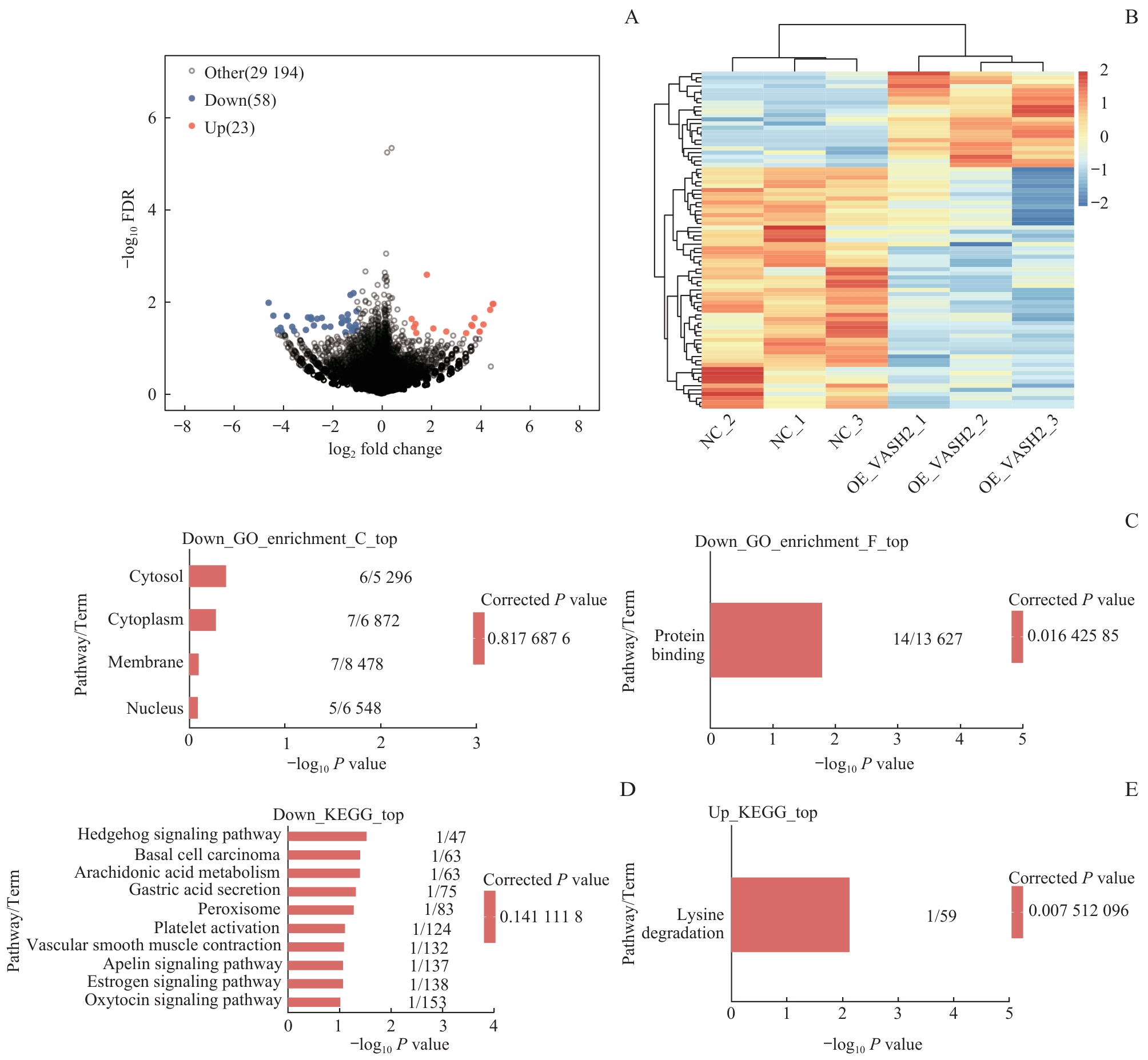 | 图4 VASH2 调控转录组的RNA-seq分析 Note: A. Volcano map based on differentially expressed genes (DEGs). B. Heat map of expression levels of DEGs. C. GO function enrichment bar chart. D/E. Bar charts showing KEGG pathway enrichment of downregulated DEGs (D) and upregulated DEGs (E). |