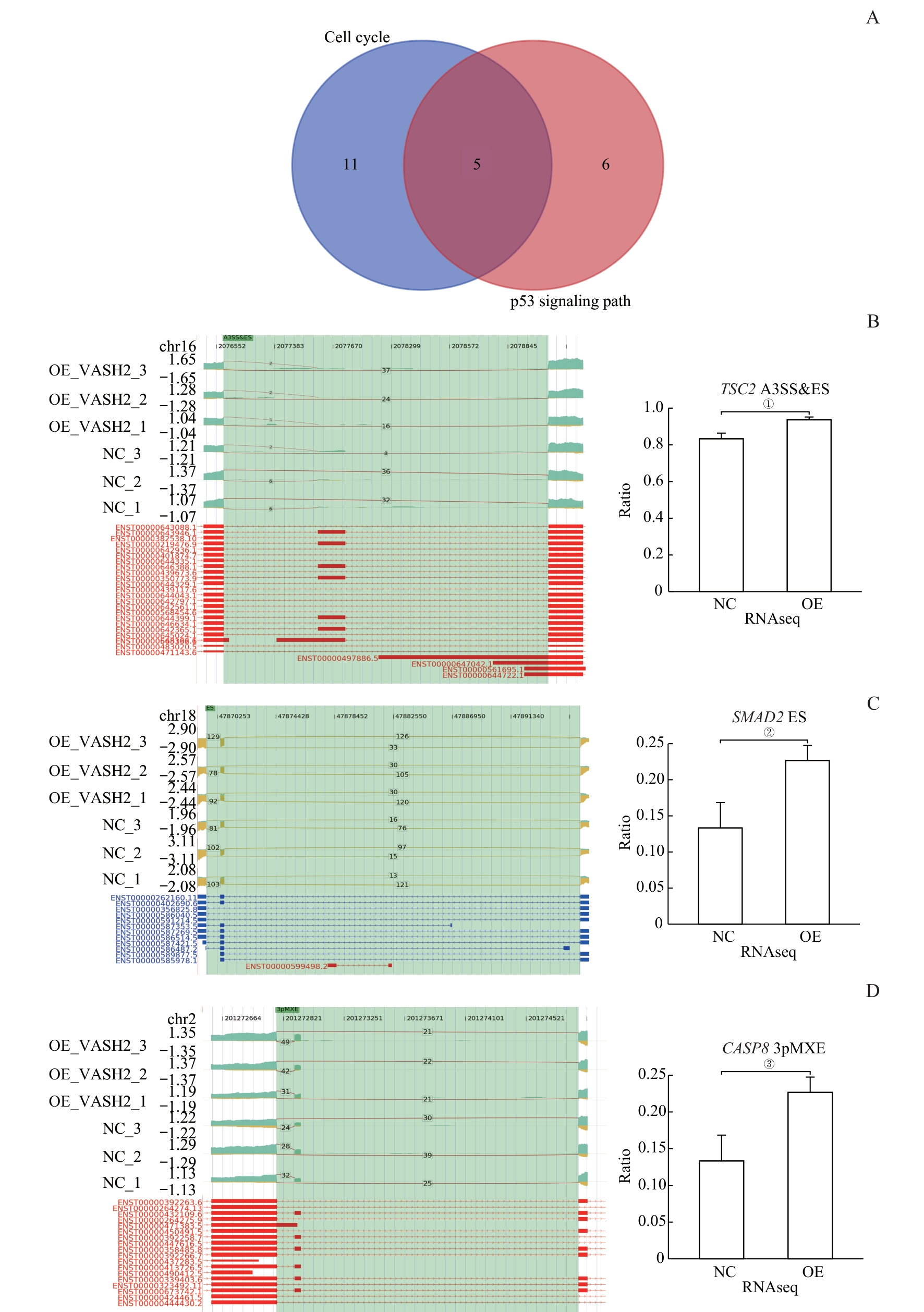 | 图6 富含细胞凋亡事件的可变剪接基因 Note: A. Wayne diagram of the gene set with significantly altered AS expression levels in the cell cycle and p53 signaling pathway. B. ASE of the VASH2-regulated gene TSC2 and IGV-sashimi plot showing A3SS & ES events. C.ASE of the VASH2-regulated gene SMAD2 and IGV-sashimi plot showing ES events. D. ASE of the VASH2-regulated gene CASP8. ①P=0.006, ②P=0.017, ③P=0.027. |