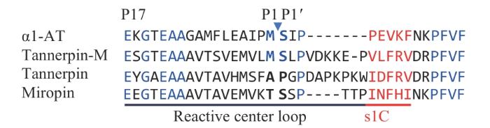 Note: α1-AT—α1-antitrypsin (Uniprot ID: A0A024R6I7); Tannerpin-M (GenBank: ETK05009.1); Tannerpin (GenBank: PNE27936.1); Miropin (GenBank: TPE18305.1); s1C—strand 1 of β-sheet C.