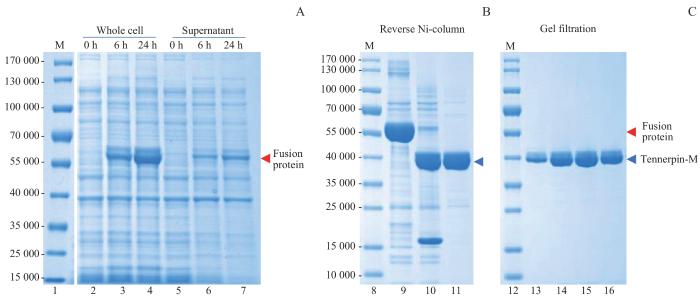 Note: A. Protein expression of Tannerpin-M fusion protein in whole bacterial cell lysate and lysis supernatant. M—marker (Lane 1,8 and 12); Lane 2‒4—whole cell lysate of Tannerpin-M expression upon IPTG induction at 0, 6 and 24 h; Lane 5‒7—supernatant of Tannerpin-M expression cells upon IPTG induction at 0, 6 and 24 h respectively. B. Enzyme digestion of the fusion protein and purification by reverse nickel ion affinity column (Ni-column). Lane 9—HisTrap-purified SUMO3-Tannerpin-M fusion protein; Lane 10—fusion protein digested with SENP2; Lane 11—flow through of fusion protein digestion from a HisTrap column. C. Gel filtration purification of Tannerpin-M. Lane13‒16—fractions of Tannerpin-M from a gel filtration column.