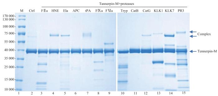 Note: M—marker (Lane 1); Lane 2—Tannerpin-M control (Ctrl). The other lanes are mixed solutions of Tannerpin-M with different serine proteases; Lane 3—FⅡa; Lane 4—HNE; Lane 5—elastase; Lane 6—APC; Lane 7—t-PA; Lane 8—FⅨa; Lane 9—FⅪa; Lane 10—trypsin; Lane 11—CatB; Lane 12—CatG; Lane 13—KLK1; Lane 14—KLK7; Lane 15—PR3.