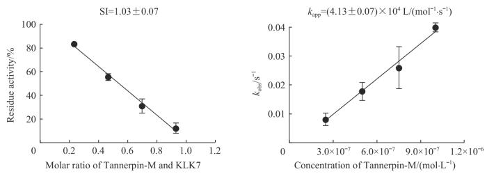 为了直观地了解Tannerpin-M抑制KLK7的能力,利用动力学方法测定Tannerpin-M与KLK7的反应速率常数。结果(图4)显示,Tannerpin-M抑制KLK7的SI值为1.03±0.07,说明一个Tannerpin-M分子基本上可以有效抑制一个蛋白酶分子。为了测定Tannerpin-M抑制KLK7的反应速度,将不同浓度的Tannerpin-M与KLK7反应不同时间,中止反应后检测残留的KLK7的活性,据此计算其一级反应速率常数(kobs),然后根据kobs和Tannerpin-M的关系,得到它们反应的二级表观速率kapp为(4.13±0.07)×104 L/(mol·s)。综合kapp×SI值可得Tannerpin-M对KLK7的二级反应速率常数k2为4.25×104 L/(mol·s)。该数值与部分其他细菌来源Serpin的二级反应速率k2类似[24-25]。