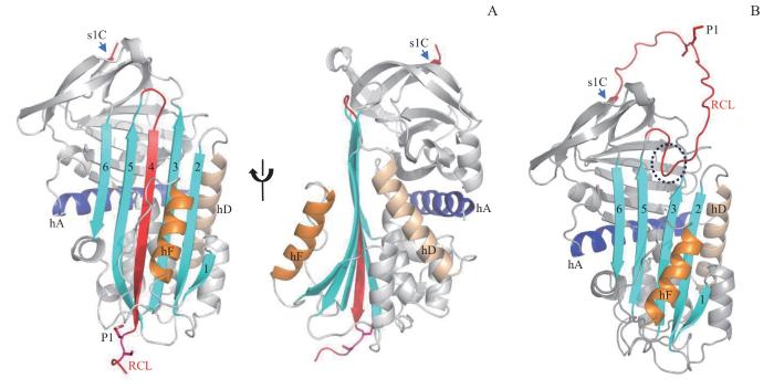 Note: A. Crystal structure of cleaved Tannerpin-M. B. Predicted structure of native Tannerpin-M. The central β-sheet A is colored in cyan with the strands traditionally numbered 1‒6 from right to left. RCL is colored in red, helix A (hA) is colored in purple, helix F (hF) is colored in orange, and helix D (hD) is colored in gray. P1-P1' residue is shown in sticks.