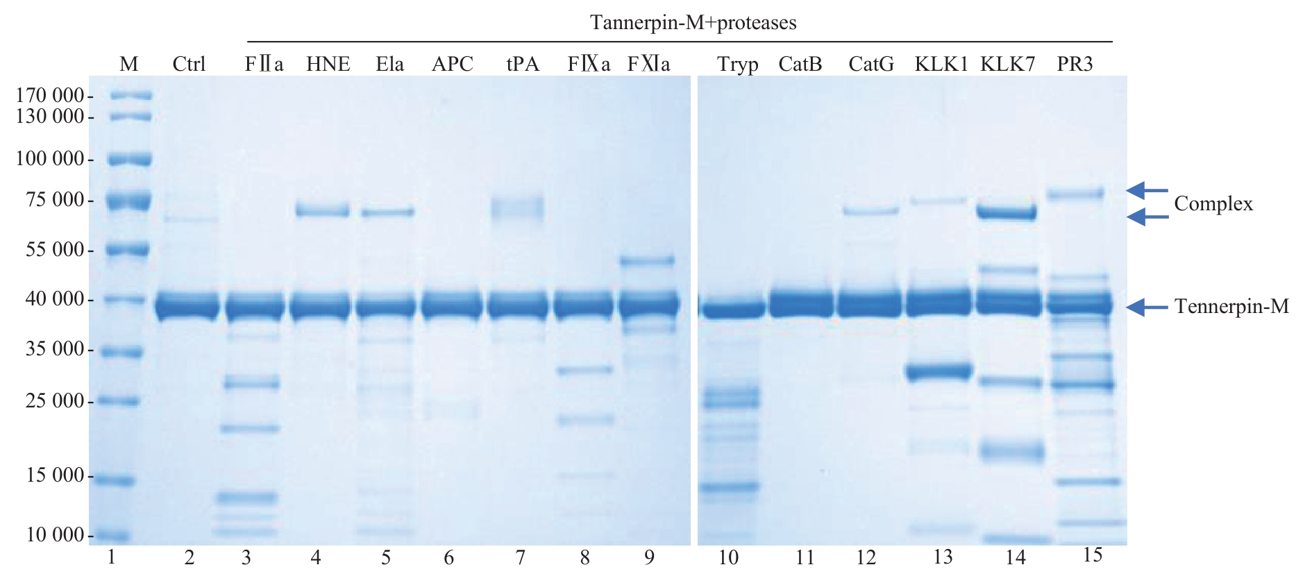 | 图3 Tannerpin-M抑制丝氨酸蛋白酶的特异性 Note: M—marker (Lane 1); Lane 2—Tannerpin-M control (Ctrl). The other lanes are mixed solutions of Tannerpin-M with different serine proteases; Lane 3—FⅡa; Lane 4—HNE; Lane 5—elastase; Lane 6—APC; Lane 7—t-PA; Lane 8—FⅨa; Lane 9—FⅪa; Lane 10—trypsin; Lane 11—CatB; Lane 12—CatG; Lane 13—KLK1; Lane 14—KLK7; Lane 15—PR3. |
