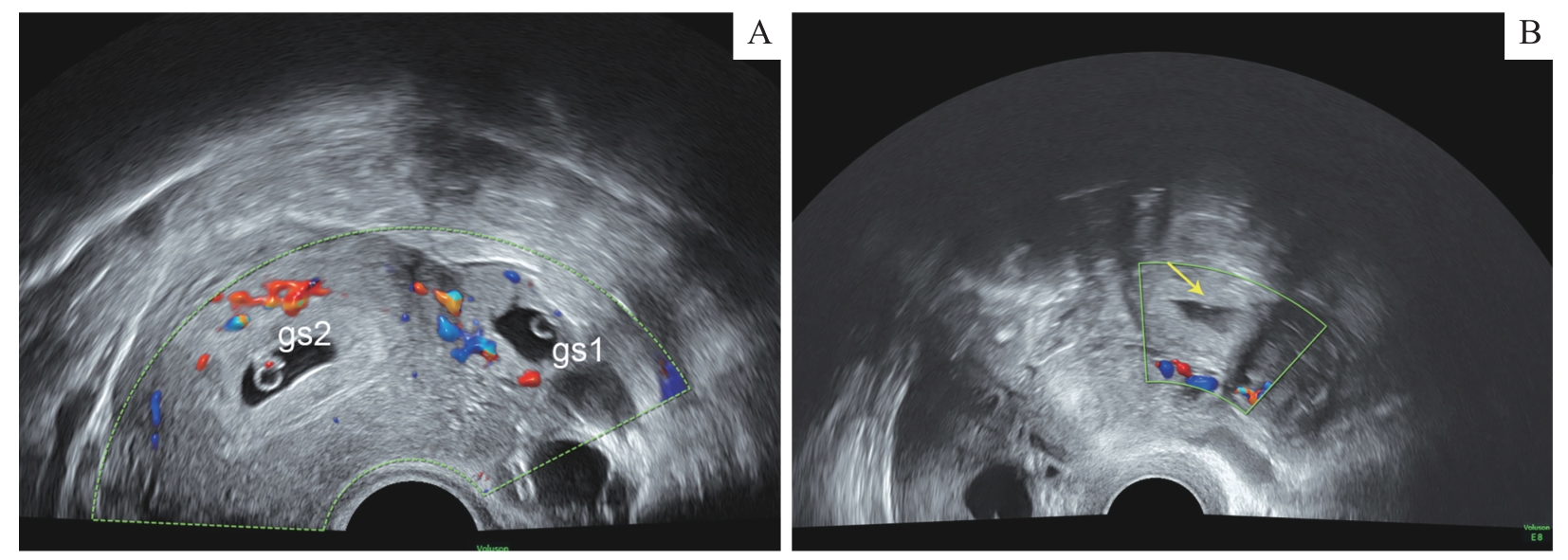 | 图2 超声检查THP代表图像 Note:A. Type Ⅰ (type of gestational sac). B. Type Ⅱ (type of mixed echo). The arrow indicates mixed mass of fallopian tube. gs1—gestational sac in uterus; gs2—gestational sac in fallopian tube. |