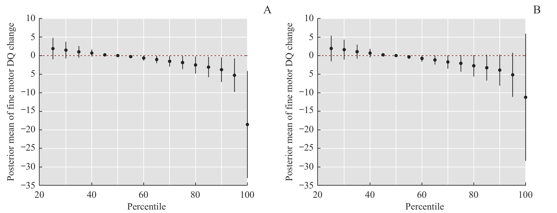 | 图1 通过BKMR模型分析出生前母体4种重(类)金属复合暴露对幼儿精细动作发育的总效应 Note: The overall concentration of the four heavy metals/metalloid (Mn, Cr, As, and Pb) at the P50 level was used as the reference (dashed lines). A. Without adjustment for confounders. B. After adjusting for maternal age, maternal education, gestational age, child age, and child gender. |