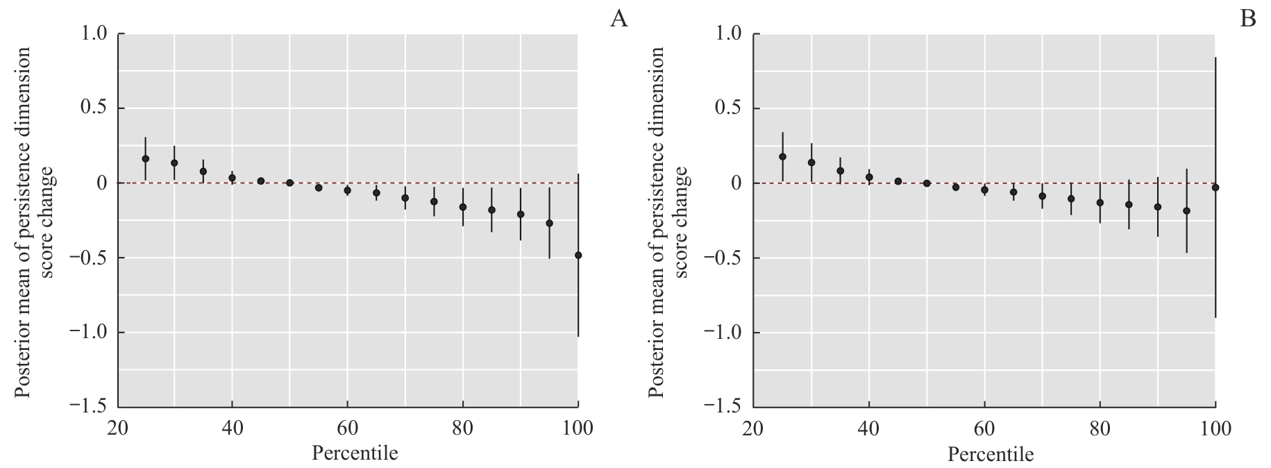 | 图3 通过BKMR模型分析出生前母体4种重(类)金属复合暴露对幼儿坚持性维度的总效应 Note: The overall concentration of the four heavy metals/metalloid (Mn, Cr, As, and Pb) at the P50 level was used as the reference (dashed lines). A. Without adjustment for confounders. B. After adjusting for maternal age, maternal education, gestational age, child age, and child gender. |