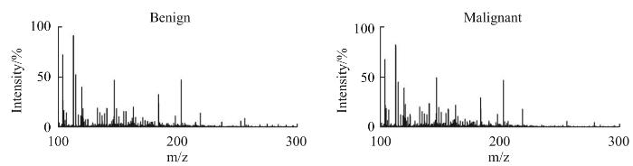 本研究通过基质辅助激光解吸电离质谱(matrix-assisted laser desorption/ionization mass spectrometry,MALDI-MS)技术对2组患者(良恶性肺结节)的血清行代谢指纹图谱检测,具体如 图1所示。