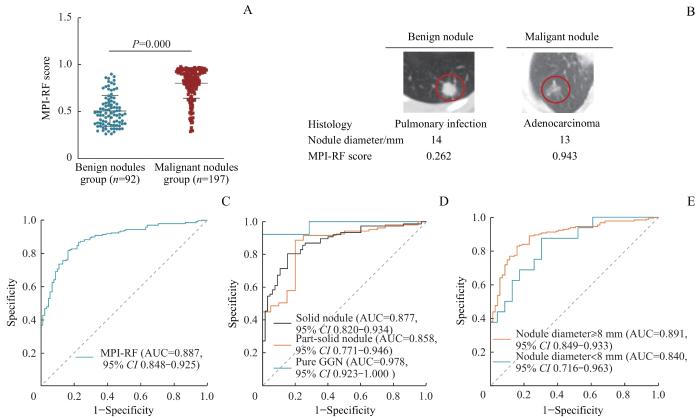 Note: A. MPI-RF scores of the patients in malignant nodule group and benign nodule group. B. Relationship between MPI-RF score and imaging results of benign and malignant pulmonary nodules. C. ROC curve of MPI-RF in benign and malignant pulmonary nodules. D. ROC curve of MPI-RF in different nodule types. E. ROC curves of MPI-RF in different nodule sizes. GGN—ground-glass nodule.