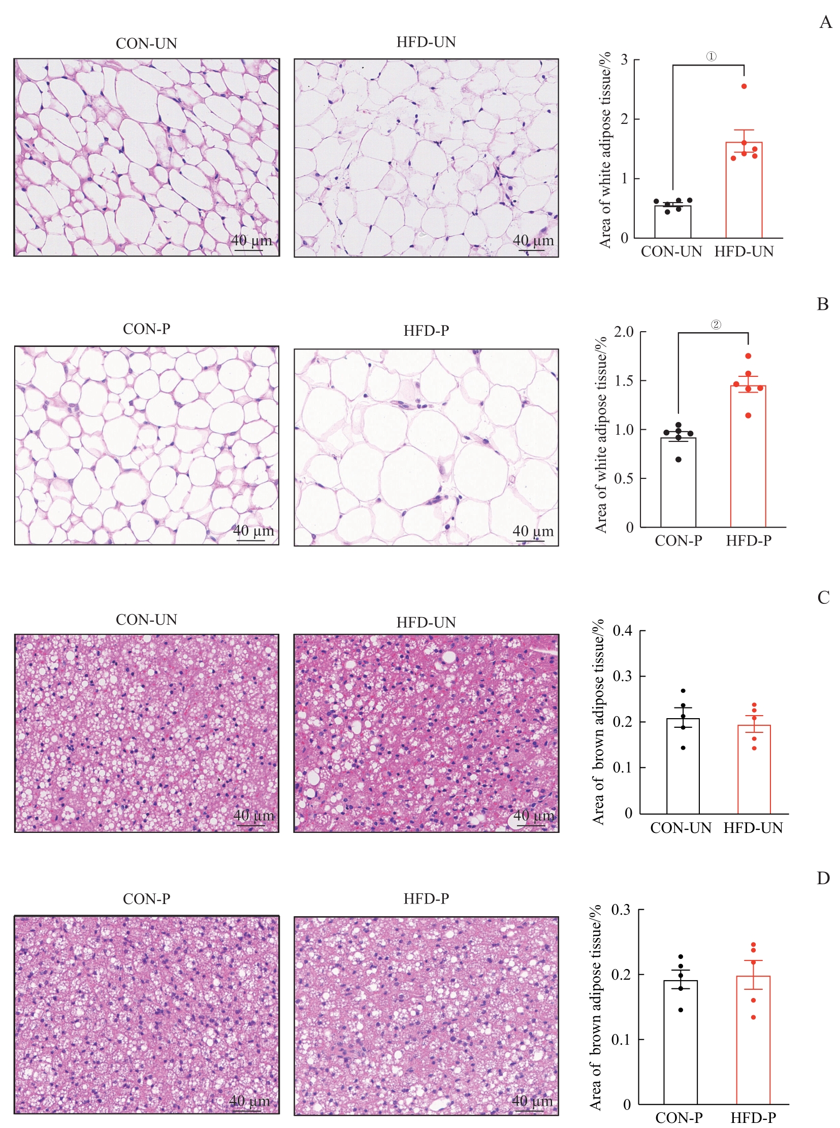 | 图2 高脂饮食后育龄期和妊娠末期雌鼠白色脂肪组织和棕色脂肪组织结构变化 Note: A/B. The structure of white adipose tissues and the proportion of cell area to total area in mice at reproductive age (A) and at the end of pregnancy (B). C/D. The structure of brown adipose tissues and the proportion of cell area to total area in mice at reproductive age (C) and at the end of pregnancy (D). ①P=0.002; ②P=0.000. |