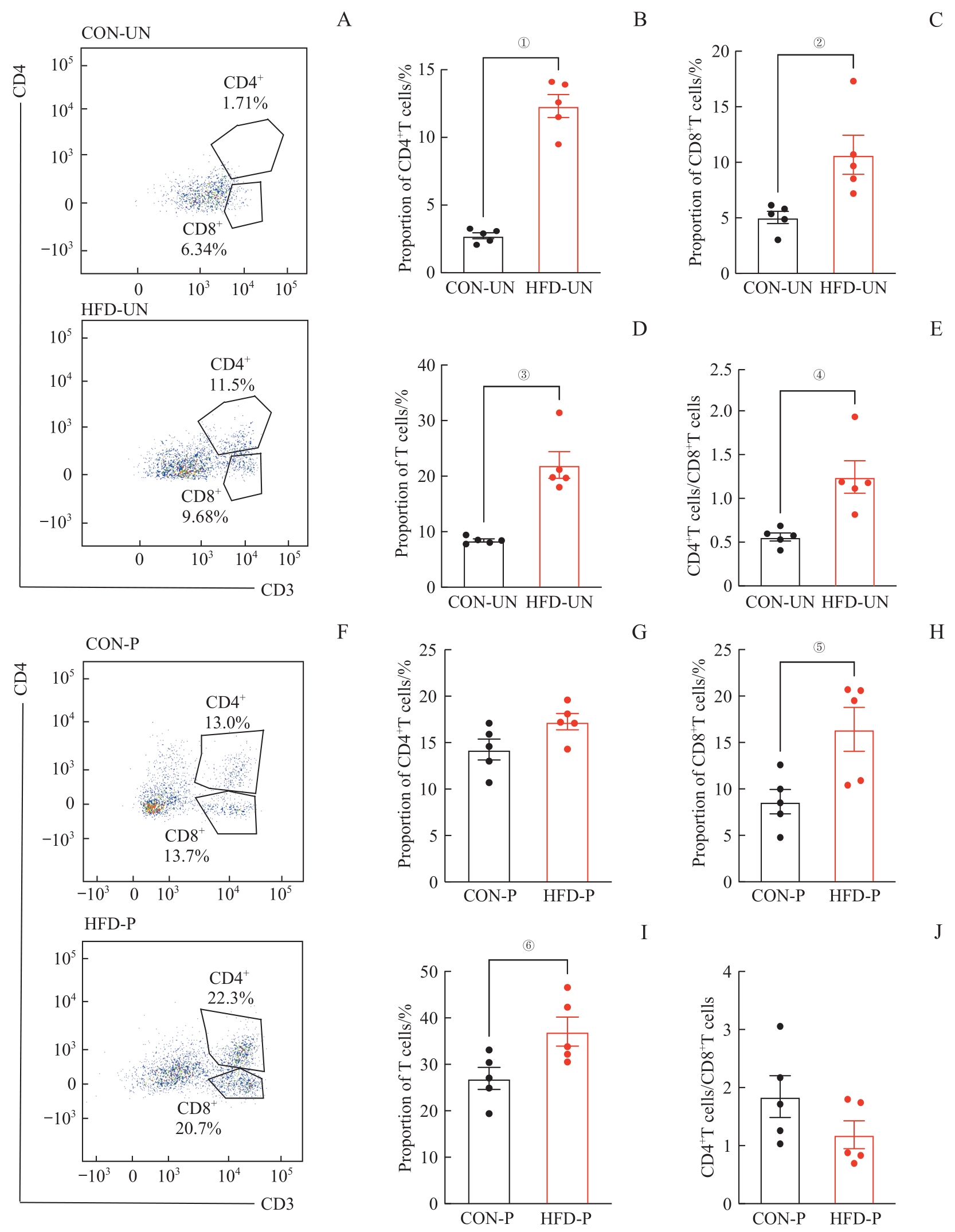| 图3 高脂饮食后育龄期和妊娠末期雌鼠脂肪组织中T细胞比例变化 Note: A. Scatter diagram of T cells in the adipose tissues of female mice at reproductive age. B?E. The proportion of CD4+T cells (B), CD8+T cells (C), T cells (D) and CD4+T cells/CD8+T cells (E) in adipose tissues of female mice at reproductive age. F.Scatter diagram of T cells in the adipose tissues of female mice at the end of pregnancy. G?J. The proportion of CD4+T cells (G), CD8+T cells (H), T cells (I) and CD4+T cells/CD8+T cells (J) in adipose tissues of female mice at the end of pregnancy. ①P=0.000; ②P=0.030; ③P=0.005; ④P=0.019; ⑤P=0.021; ⑥P=0.033. |
