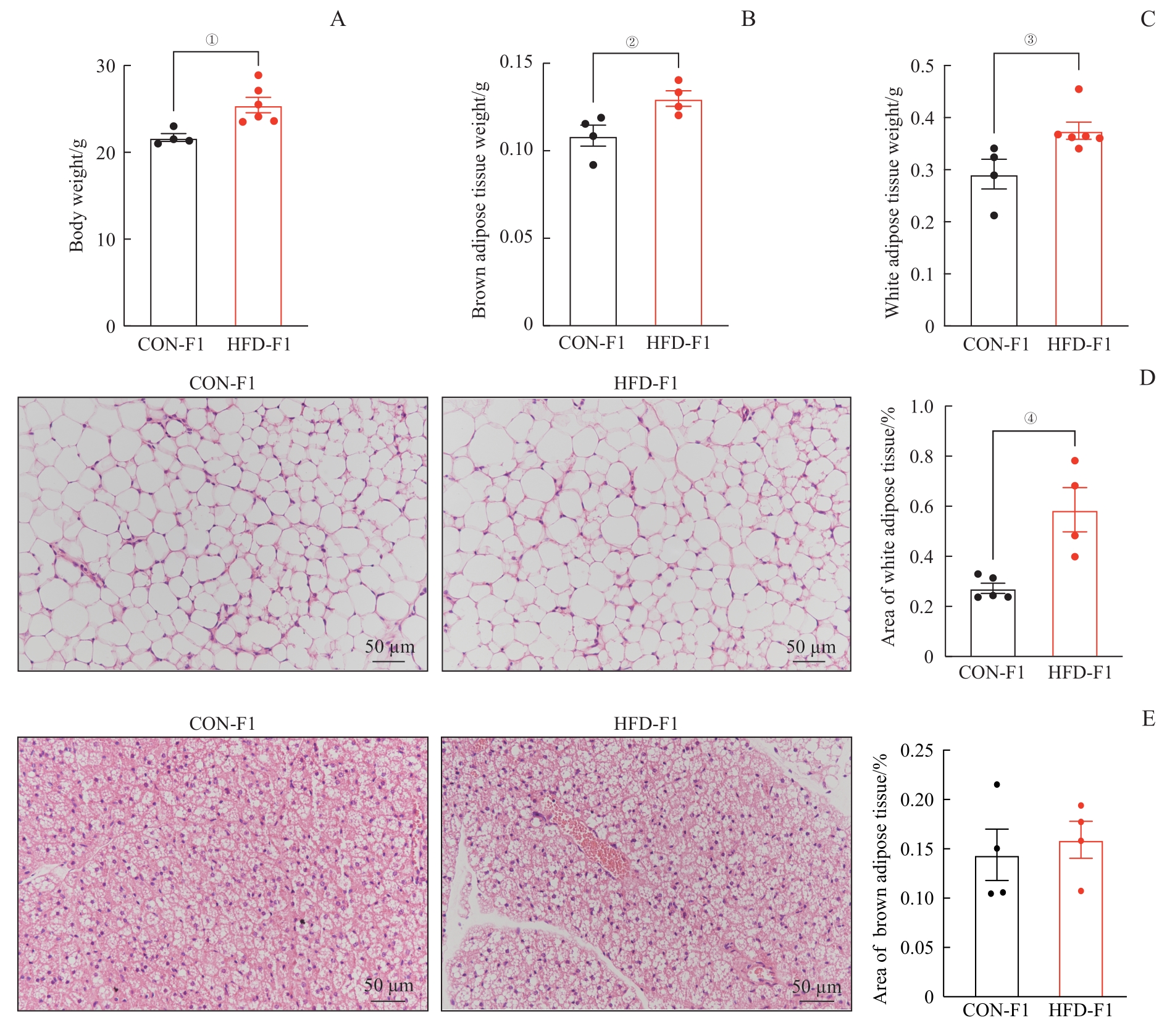 | 图6 母鼠高脂饮食后子代体质量、脂肪组织质量及脂肪组织结构的变化 Note: A. The body weight of offspring. B/C.The weight of brown adipose tissues (B) and white adipose tissues (C) of offspring. D. The structure of white adipose tissues and the proportion of cell area to total area in offspring. E. The structure of brown adipose tissues and the proportion of cell area to total area in offspring. ①P=0.012; ②P=0.030; ③P=0.026; ④P=0.035. |