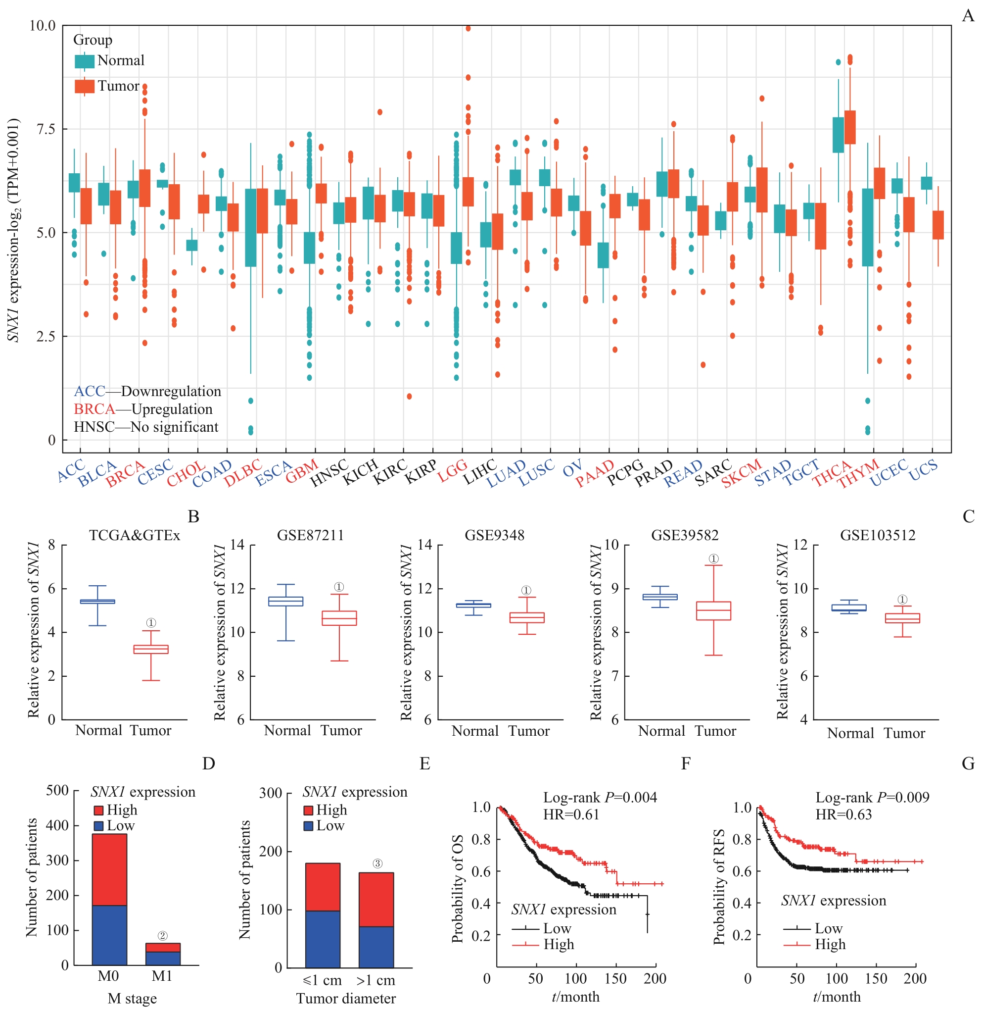 | 图2 SNX1 在CRC数据库中表达情况及其与临床病理信息的相关性分析 Note: A. Expression levels of SNX1 mRNA in human cancers. TPM—transcript per million. B. Expression levels of SNX1 mRNA in CRC tissues and normal colon tissues from the TCGA and GTEx databases. C. Expression levels of SNX1 mRNA in CRC tissues and normal colon tissues from the GEO databases. D. Correlation between SNX1 mRNA expression and M stage of patients from the TCGA database. E. Correlation between SNX1 mRNA expression and tumor size in patients from the TCGA database. F. Correlation between SNX1 mRNA expression and overall survival (OS) in patients from the GSE39582 database. G. Correlation between SNX1 mRNA expression and recurrence-free survival (RFS) in patients from the GSE39582 database. ①P=0.000, compared with normal colon tissues; ②P=0.022, compared with M0 groups; ③P=0.041, compared with the ≤1 cm groups. |