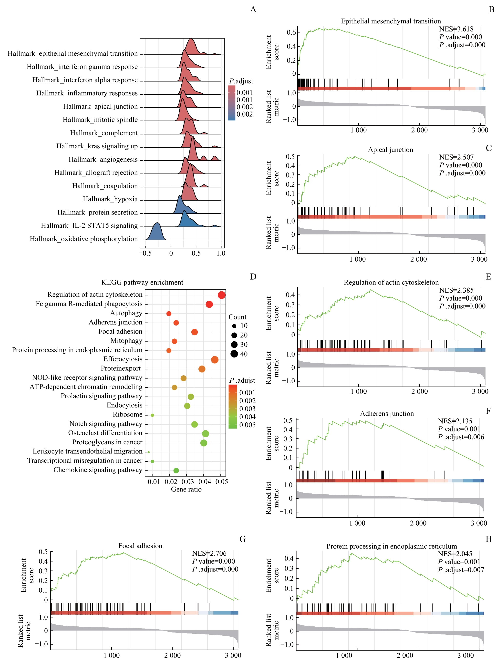 | 图4 SNX1相关信号通路的富集分析 Note: A. Ridgeline plots of Hallmark enrichment analysis based on SNX1 low-expression and high-expression groups. B/C. GSEA showed that EMT signaling pathway (B) and apical junction pathway (C) were enriched in the SNX1 low-expression group. D. Dot plots of KEGG enrichment analysis based on the SNX1 low-expression and high-expression groups. E?H. GSEA showed that regulation of actin cytoskeleton pathway (E), adherens junction pathway (F), focal adhesion (G) and protein processing in endoplasmic reticulum pathway (H) were enriched in the SNX1 low-expression group. |