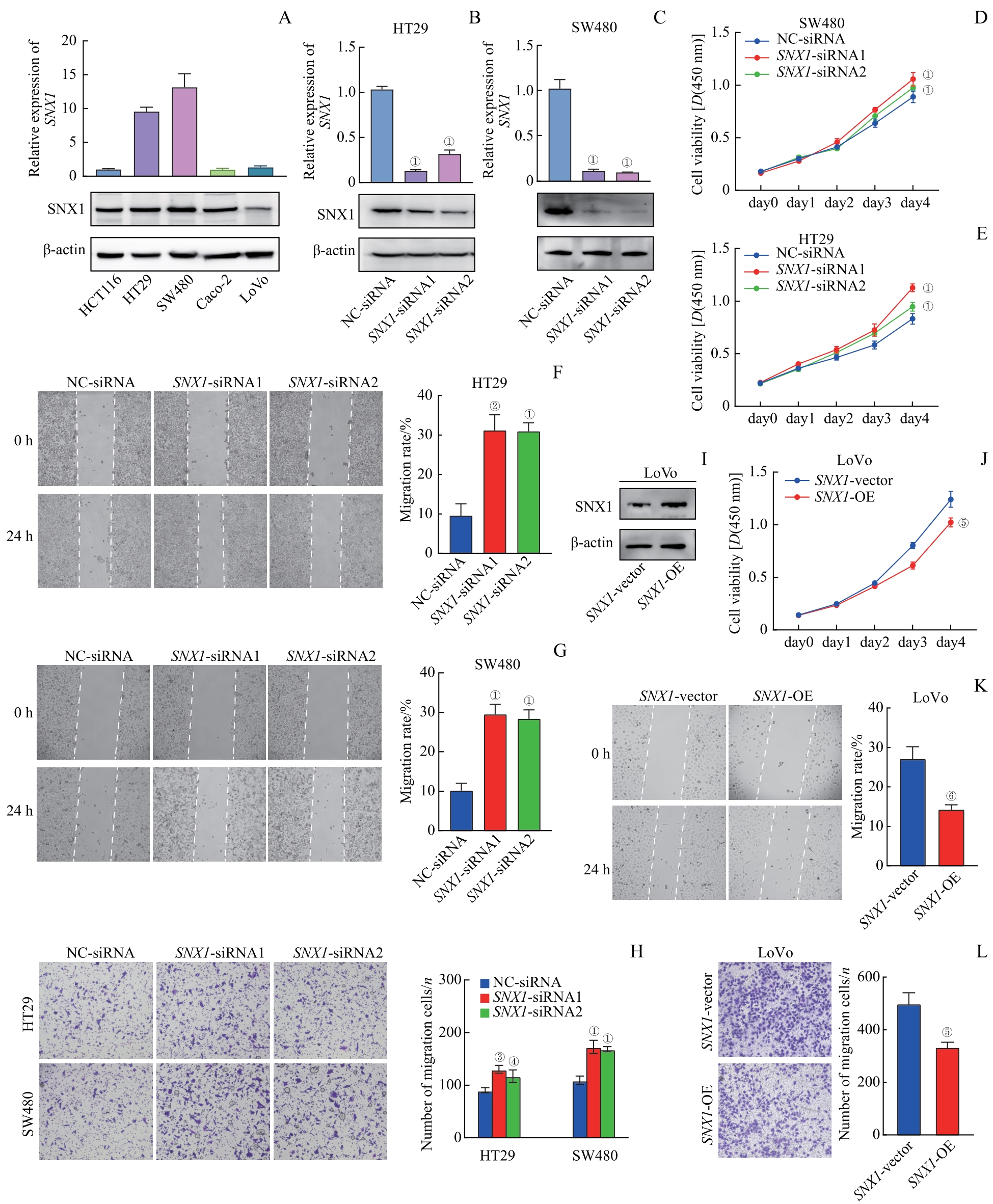 | 图5 SNX1的表达水平对CRC细胞增殖和迁移的影响 Note: A. Expression levels of SNX1 detected by qPCR and western blotting in CRC cell lines. B/C. Transfection efficiency of SNX1-siRNA verified by qPCR (top) and western blotting (bottom) in HT29 cells (B) and SW480 cells (C). D/E. Effect of SNX1-siRNA knockdown on HT29 cell (D) and SW480 cell (E) proliferation detected by CCK-8. F/G. Effect of SNX1-siRNA knockdown on HT29 cell (F) and SW480 cell (G) migration (left) detected by wound healing assay and analysis of migration rate (right). H. Effect of SNX1-siRNA knockdown on HT29 cell (top) and SW480 cell (bottom) migration (left) detected by Transwell assay and analysis of migration cells (right). I. Overexpression efficiency of SNX1-OE verified by western blotting in LoVo cells. J. Effect of SNX1-OE overexpression on LoVo cell proliferation detected by CCK-8. K. Effect of SNX1-OE overexpression on LoVo cell migration (left) detected by wound healing assay and analysis of migration rate (right). L. Effect of SNX1-OE overexpression on LoVo cell migration (left) detected by Transwell assay and analysis of migration cells (right). ①P=0.000, ②P=0.003, ③P=0.000, ④P=0.005, compared with the NC-siRNA group; ⑤P=0.000, ⑥P=0.003, compared with the SNX1-vector group. |