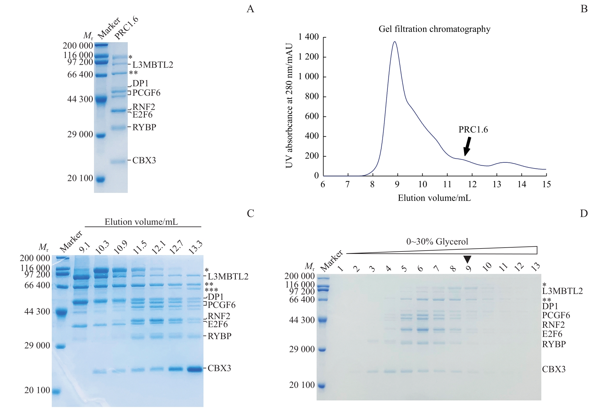 | 图2 人源PRC1.6七元复合物蛋白纯化 Note: A. SDS-PAGE analysis of the PRC1.6 heptameric complex after anti-DYKDDDDK G1 affinity purification. B. Gel filtration chromatography of the PRC1.6 heptameric complex with Superdex 200 Increase 10/300 GL. C. SDS-PAGE of gel filtration chromatography in B. D. SDS-PAGE of protein fractions after glycerol density gradient centrifugation. * denotes TRIM28 (Mr 110 000), ** denotes HSP70 (Mr 70 000), and *** denotes HRV-3C enzyme (Mr 66 400). AU—absorbance unit. |