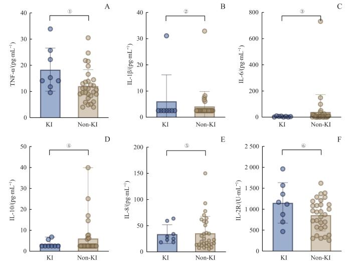 Note: A. TNF-α level. B. IL-1β level. C. IL-6 level. D. IL-10 level. E. IL-8 level. F. IL-2R level. ①P=0.015, ②P=0.931, ③P=0.428, ④P=0.598, ⑤P=0.470, ⑥P=0.130.