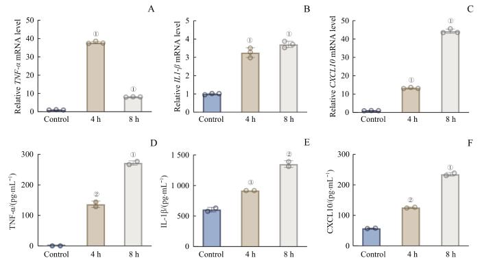 Note: A‒C. Fold changes in TNF-α (A), IL1-β (B) and CXCL10 (C) mRNA levels in THP-1 cells upon stimulation with S1 spike protein at a concentration of 500 ng/mL for 4 h and 8 h. D‒F. Levels of TNF-α (D), IL-1β (E) and CXCL10 (F) in the supernatants of THP-1 cells stimulated with S1 spike protein (500 ng/mL) for 4 h and 8 h. ①P<0.001, ②P=0.001, ③P=0.008, compared with the control.