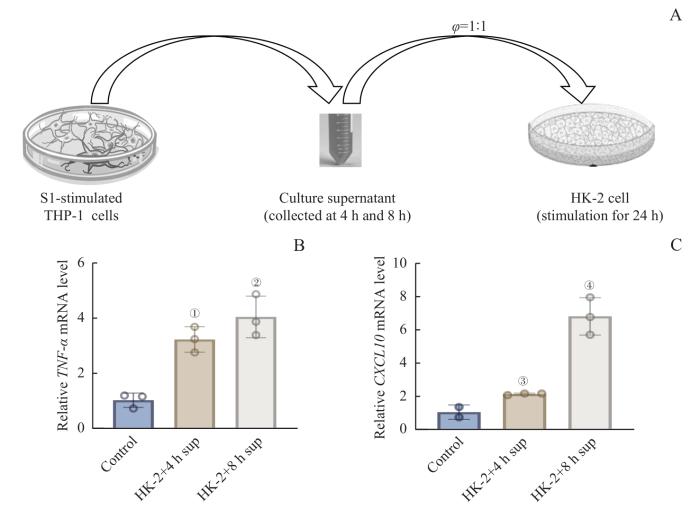 Note: A. Diagram of the culture of HK-2 cells in conditioned medium for 24 h. Conditioned medium was obtained by stimulating THP-1 cells with S1 spike protein (500 ng/mL) for 4 h and 8 h. B. Fold changes in TNF-α mRNA levels in HK-2 cells cultured in conditioned medium compared to control HK-2 cells. C. Fold changes in CXCL10 mRNA levels in HK-2 cells cultured in conditioned medium compared to control HK-2 cells. ①P=0.005, compared with the control; ②P=0.225, compared with the HK-2+4 h sup; ③P=0.324, compared with the control; ④P=0.001, compared with the HK-2+4 h sup.