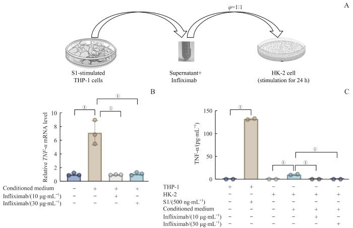 Note: A. Diagram of the culture of HK-2 cells in conditioned medium with the addition of Infliximab for 24 h. Conditioned medium was obtained by stimulating THP-1 cells with S1 protein (500 ng/mL) for 8h. B. Fold changes in TNF-α mRNA levels in HK-2 cells cultured in conditioned medium with the addition of Infliximab. C. TNF-α levels in THP-1 cells stimulated with S1 spike protein and in HK-2 cells cultured in conditioned medium with or without the addition of Infliximab. ①P<0.001.