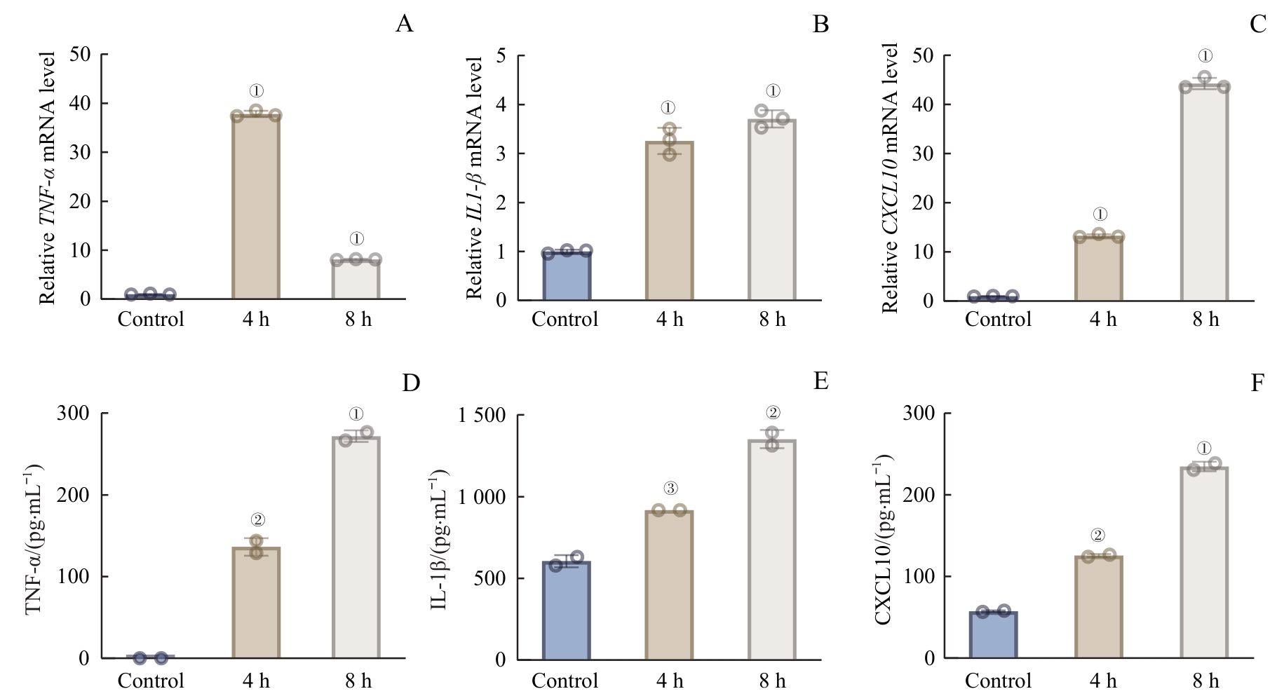 | 图3 SARS-CoV-2 S1重组蛋白体外刺激THP-1巨噬细胞产生炎症因子的水平 Note: A‒C. Fold changes in TNF-α (A), IL1-β (B) and CXCL10 (C) mRNA levels in THP-1 cells upon stimulation with S1 spike protein at a concentration of 500 ng/mL for 4 h and 8 h. D‒F. Levels of TNF-α (D), IL-1β (E) and CXCL10 (F) in the supernatants of THP-1 cells stimulated with S1 spike protein (500 ng/mL) for 4 h and 8 h. ①P<0.001, ②P=0.001, ③P=0.008, compared with the control. |