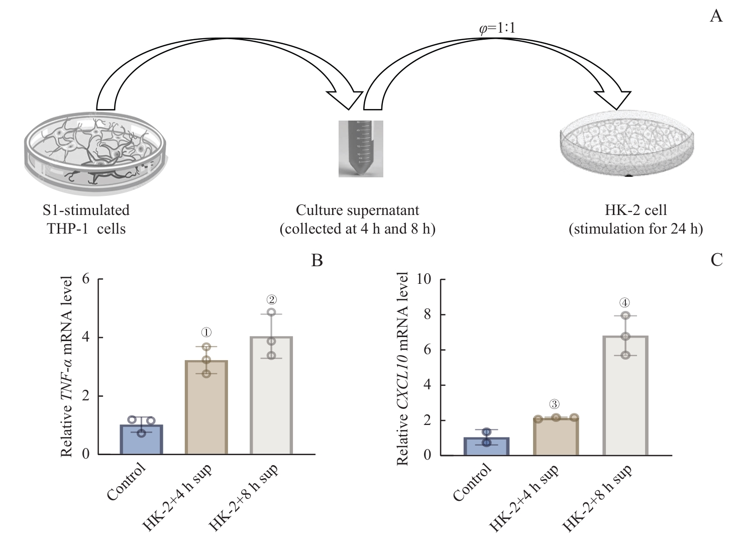 | 图4 经S1蛋白处理的THP-1细胞培养上清可诱导HK-2细胞的炎性特征 Note: A. Diagram of the culture of HK-2 cells in conditioned medium for 24 h. Conditioned medium was obtained by stimulating THP-1 cells with S1 spike protein (500 ng/mL) for 4 h and 8 h. B. Fold changes in TNF-α mRNA levels in HK-2 cells cultured in conditioned medium compared to control HK-2 cells. C. Fold changes in CXCL10 mRNA levels in HK-2 cells cultured in conditioned medium compared to control HK-2 cells. ①P=0.005, compared with the control; ②P=0.225, compared with the HK-2+4 h sup; ③P=0.324, compared with the control; ④P=0.001, compared with the HK-2+4 h sup. |