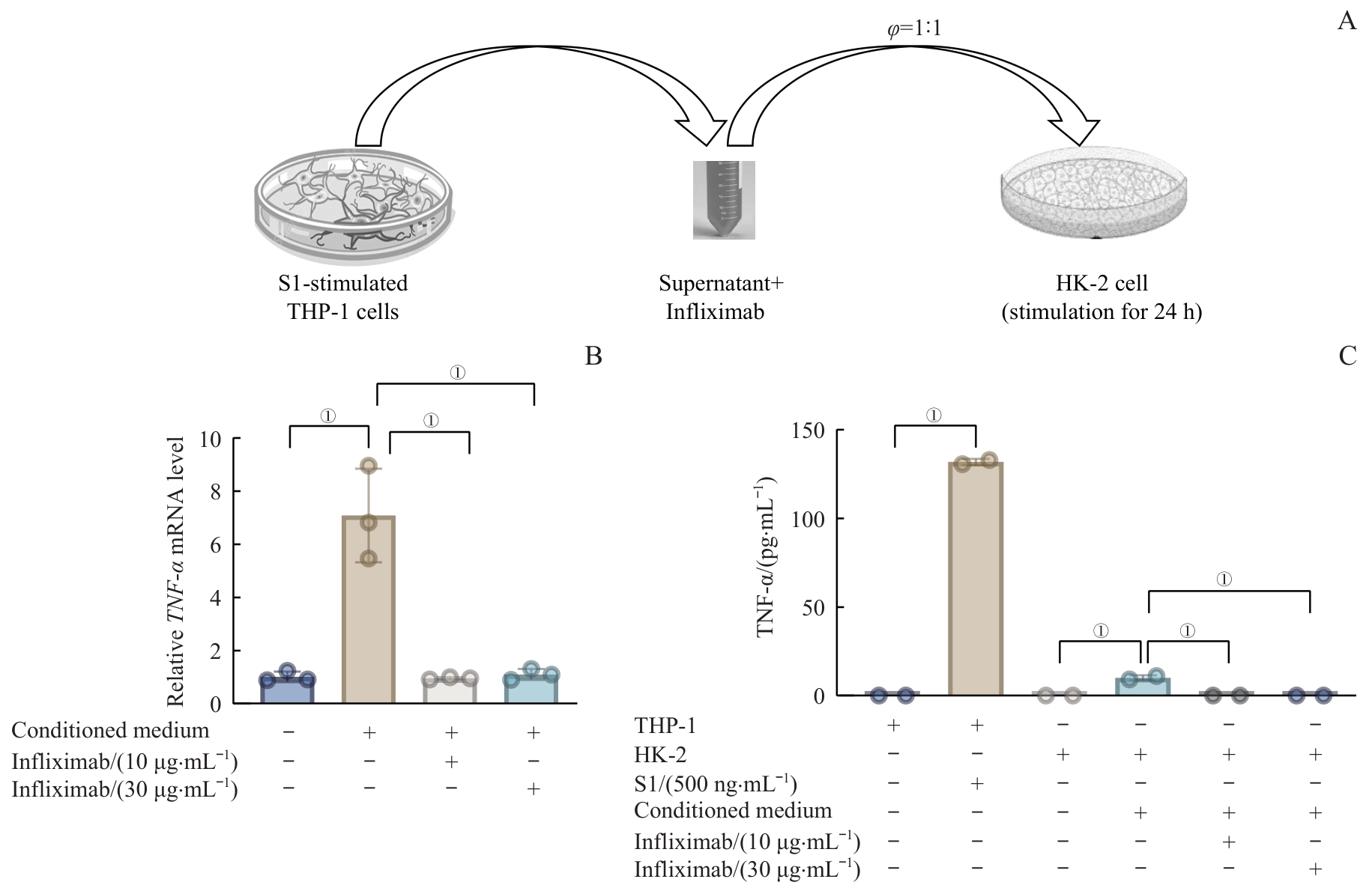 | 图5 HK-2细胞的炎症反应依赖于S1蛋白处理THP-1细胞产生的TNF-α Note: A. Diagram of the culture of HK-2 cells in conditioned medium with the addition of Infliximab for 24 h. Conditioned medium was obtained by stimulating THP-1 cells with S1 protein (500 ng/mL) for 8h. B. Fold changes in TNF-α mRNA levels in HK-2 cells cultured in conditioned medium with the addition of Infliximab. C. TNF-α levels in THP-1 cells stimulated with S1 spike protein and in HK-2 cells cultured in conditioned medium with or without the addition of Infliximab. ①P<0.001. |