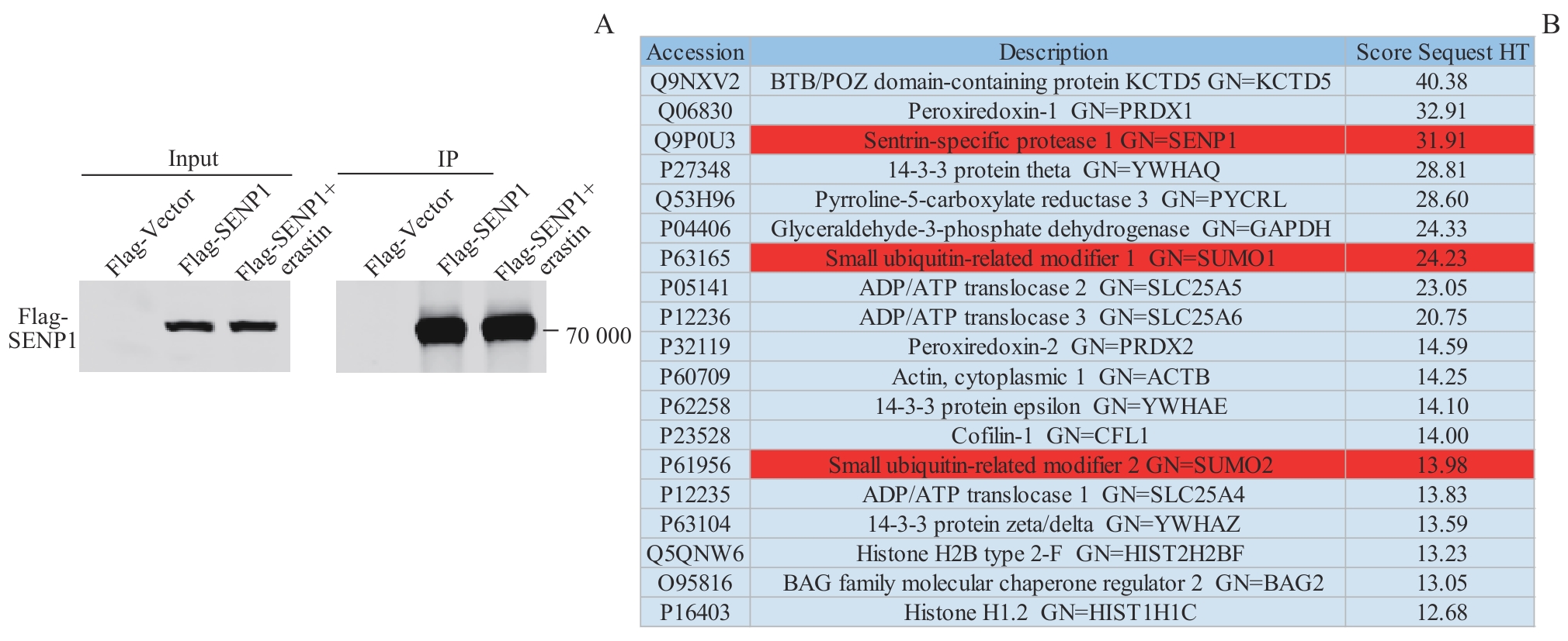 | 图3 IP-MS技术分析SENP1在铁死亡发生过程中相互作用蛋白 Note: A. Expression levels of Flag-SENP1 in 293T cells, detected by Western blotting. B. Identification results of SENP1 by IP-MS, with analysis and screening the top candidates that may interact with SENP1. |