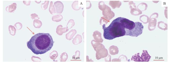 Note: A. Plasma cells of varying sizes with round nuclei (arrow). B. Plasma cells showing double nuclei, nuclear displacement, and a clear perinuclear halo (arrow).