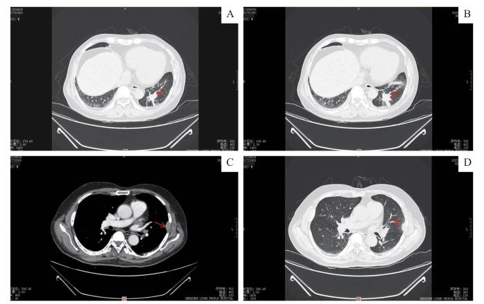 Note: A/B. Two different layers of contrast-enhanced chest CT scans. Multiple elongated strip shadows are visible around the same site, and mild sustained enhancement is visible on contrast-enhanced scans (arrow). C. Contrast-enhanced chest CT showing a chest wall mass (arrow) at the mediastinal window level. D. Contrast-enhanced chest CT showing a chest wall mass (arrow) at the lung window level.