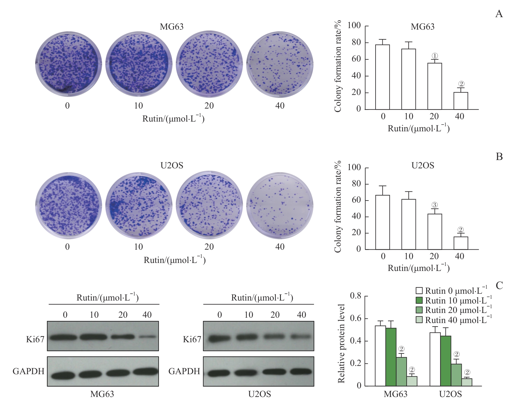 | 图2 芦丁对骨肉瘤细胞克隆形成的影响 Note:A. Representative images of MG63 cell clones and statistics of colony formation rate. B. Representative images of U2OS cell clones and statistics of colony formation rate. C. Western blotting was used to detect the expression of Ki67 protein, and the relative expression of Ki67 in MG63 and U2OS cells was analyzed. ①P=0.005, ②P<0.001, ③P=0.019, compared with the rutin 0 μmol/L group. |