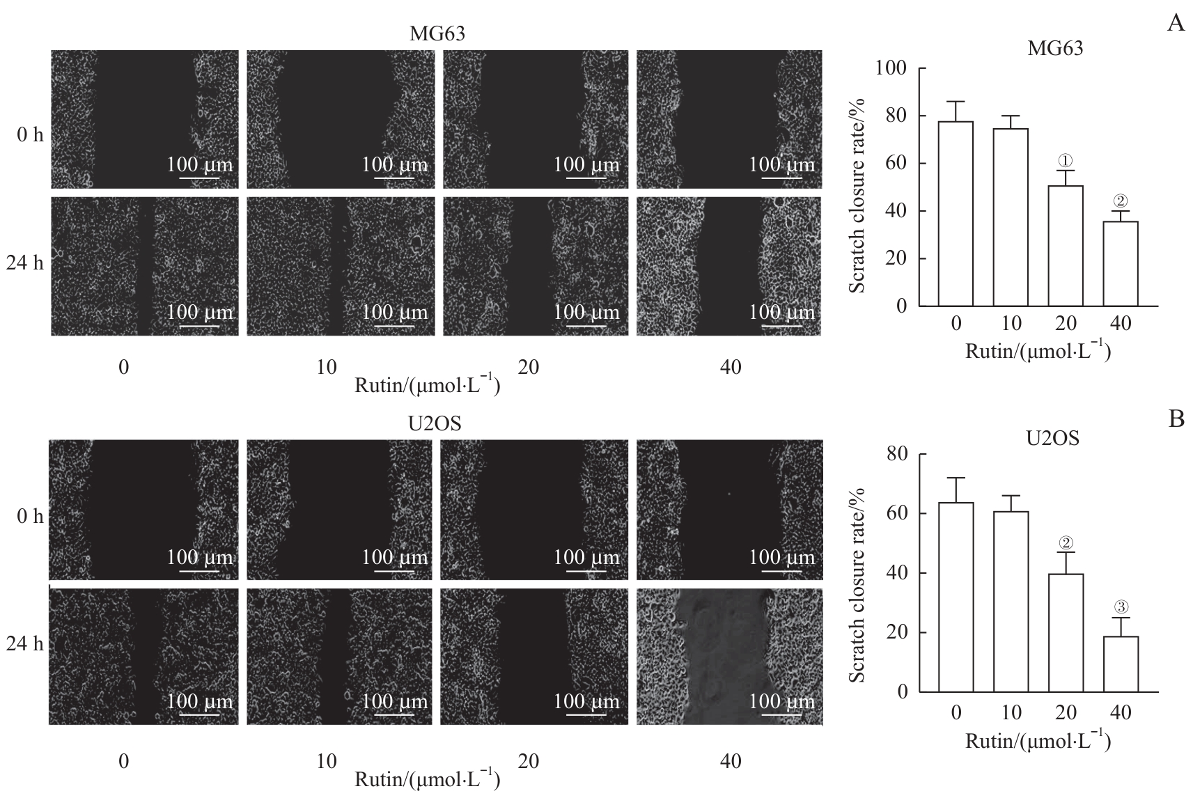 | 图4 芦丁对骨肉瘤细胞迁移的影响 Note: A. Migration ability was assessed by scratch closure assay and the scratch closure rate of MG63 cells was analyzed. B. Migration ability was assessed by scratch closure assay and the scratch closure rate of U2OS cells was analyzed. ①P=0.001, ②P<0.001, ③P=0.005, compared with the rutin 0 μmol/L group. |