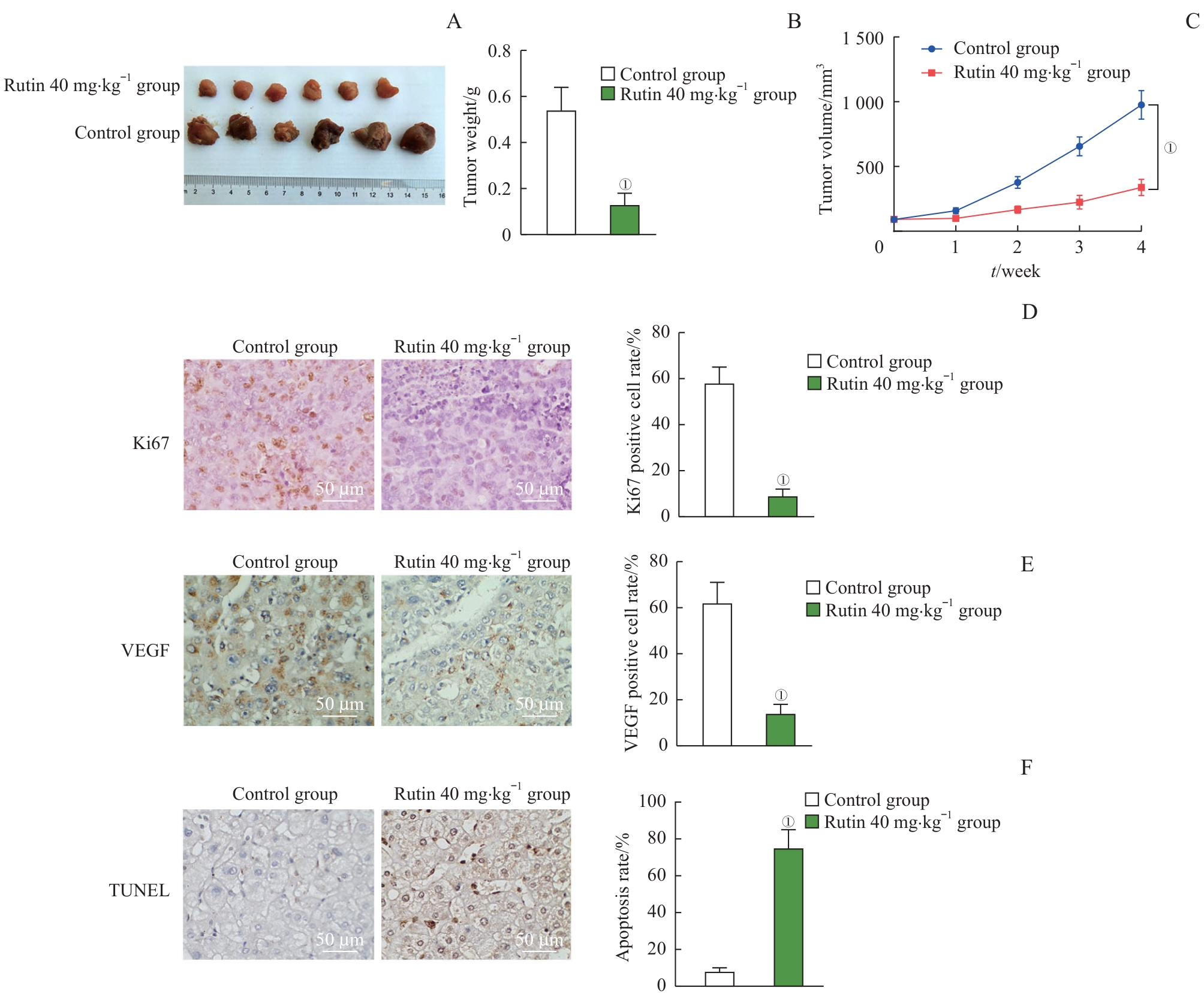 | 图6 芦丁对骨肉瘤体内移植瘤生长的影响 Note: A. Tumor image. B. Tumor weight. C. Tumor volume. D. The expression of Ki67 detected by immunohistochemistry and statistical analysis of Ki67-positive cell rate. E. The expression of VEGF detected by immunohistochemistry and statistical analysis of VEGF-positive cell rate. F. The tumor cell apoptosis detected by TUNEL and analysis of apoptosis rate. ①P<0.001, compared with the control group. |